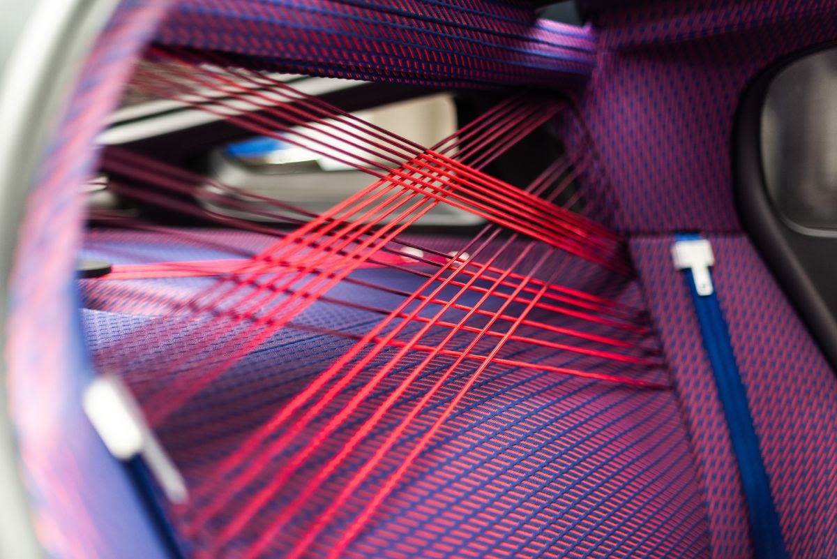 The 19_19 Concept cabin is made up of pure and clear geometric shapes with no embellishments. Boasting deep and warm colours, with a base of blue and red, similar to Ami One Concept, the cabin finish varies between blue, red and purple through the use of 3D mesh. The same fabric is used throughout the cabin on different scales, from the floor to the ceiling.