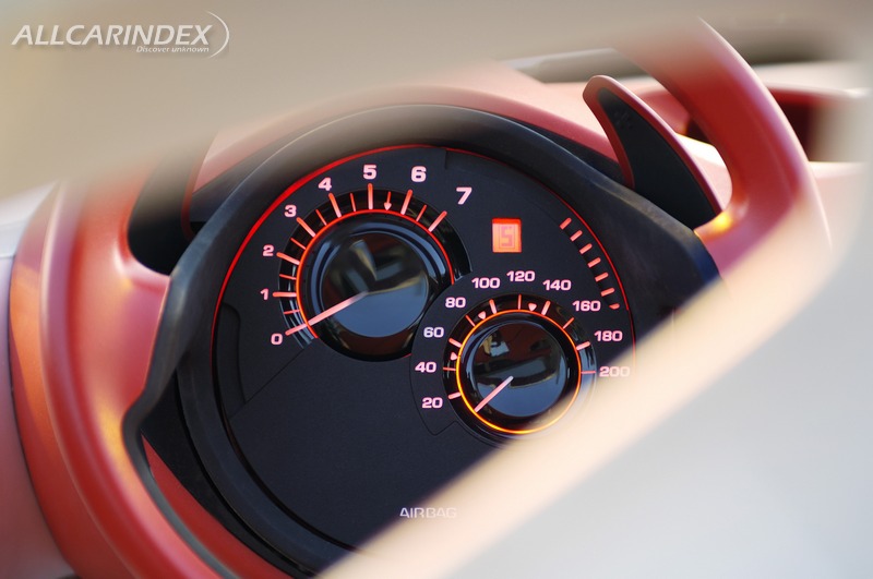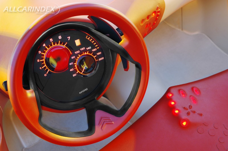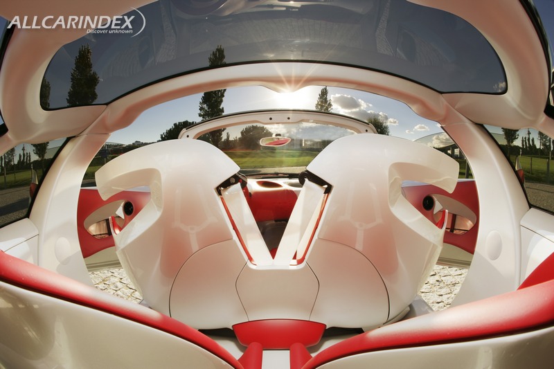 C-AirPlay was designed as a car of essential features. It is an object dedicated to automotive pleasure, fully focused on the functions and sensations that are deemed to be most important for the driver and passenger. The level of equipment provided on C-AirPlay is fairly simple, but the car makes no compromises on safety. Driving controls and information are grouped on the steering wheel in order not to break up the pure design lines of the cabin. The instruments are organised around two spheres including the speedometer, rev counter, fuel level, and other functions. This equipment is back-lit as soon as the headlamps are switched on. The colour emitted is he same shade of red as the cabin.