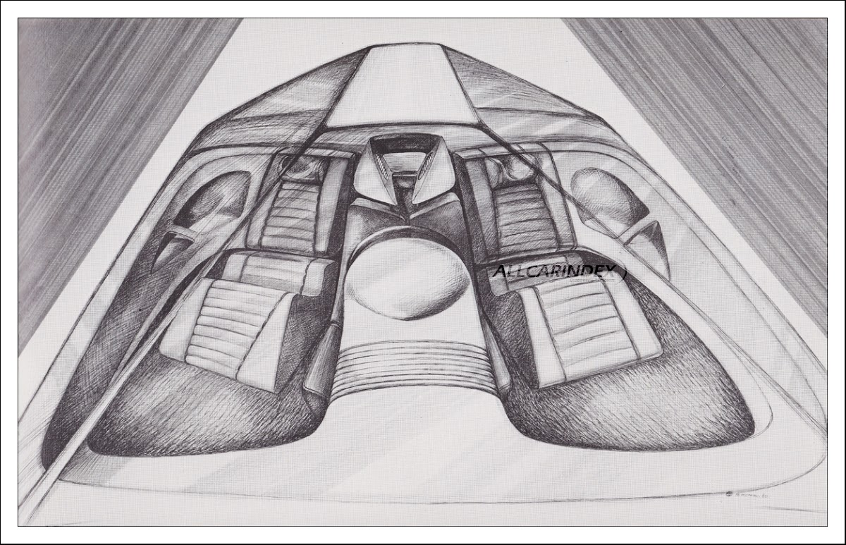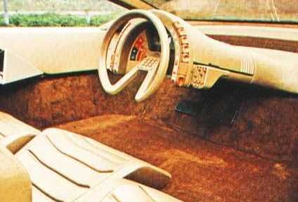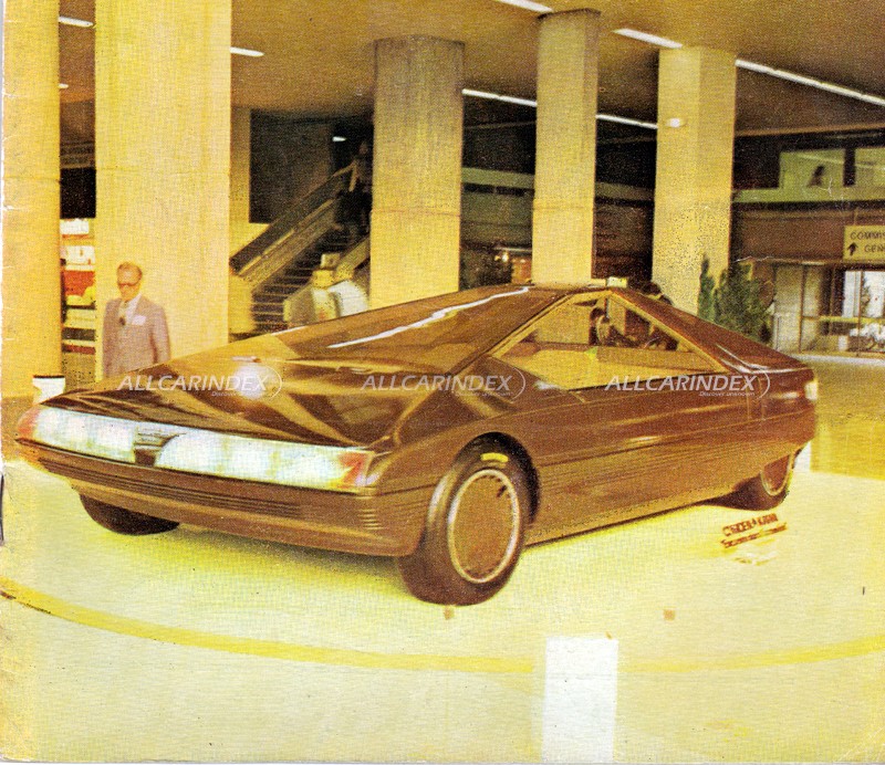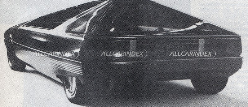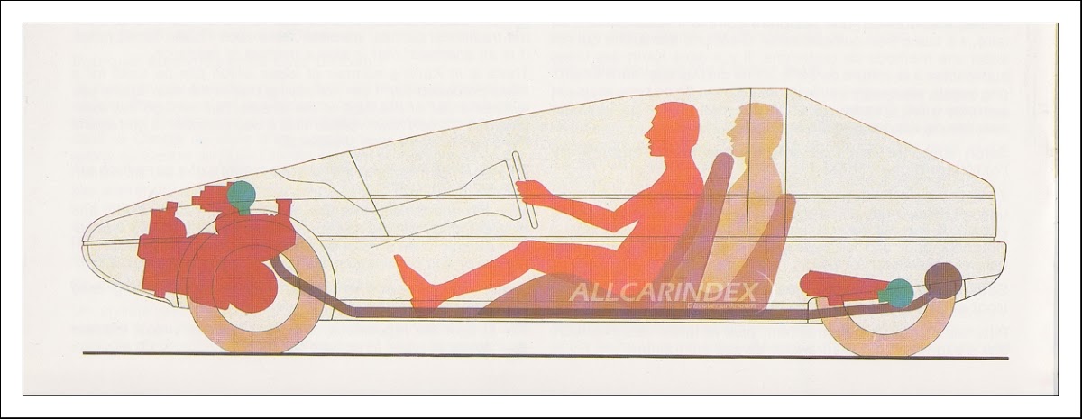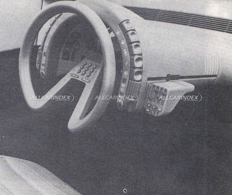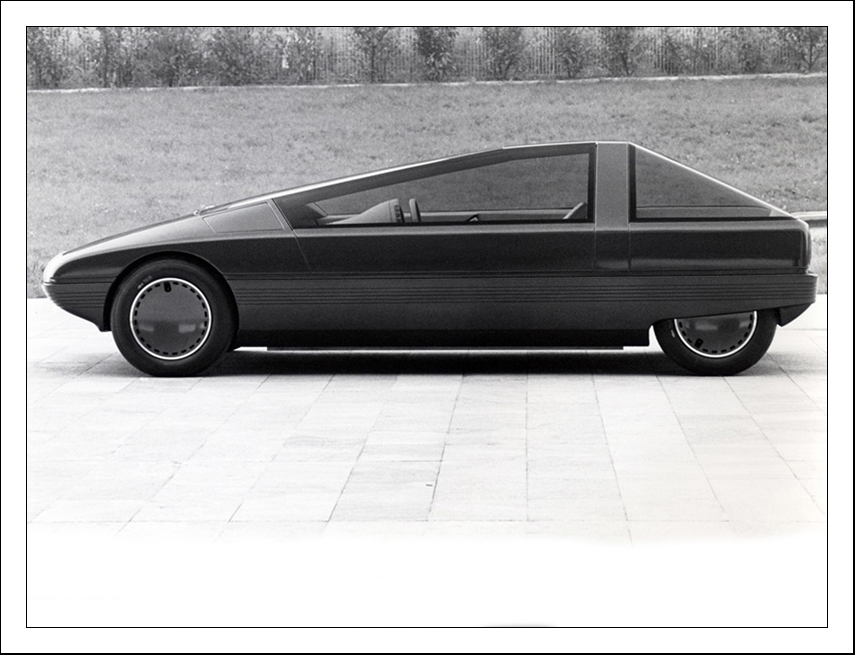 This prototype, which is a witness of the state of research in style is by hypothesis a middle-range car: a two-doors three-seater bat’s wing coupe with three seats out of line and centered driving position. It is 112 ft long, 32 ft high and 58 ft wide. It is a front-wheel-drive car.