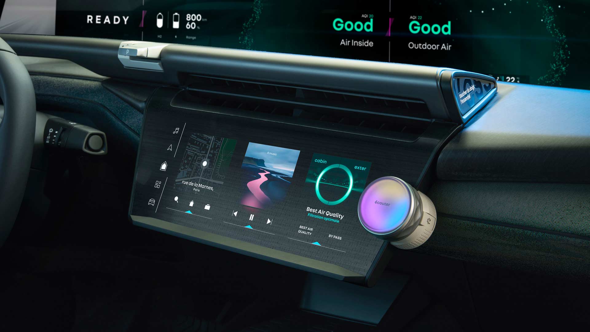 Renault Emblème is an invitation to travel with a cabin of contemporary, poetic design. The interior features innovative technologies including a new wide openR panorama screen spanning the length of the dashboard. The rear-mounted dual-energy electric powertrain is powered by electricity and hydrogen, an optimal combination for low-carbon driving over both short and long distances.