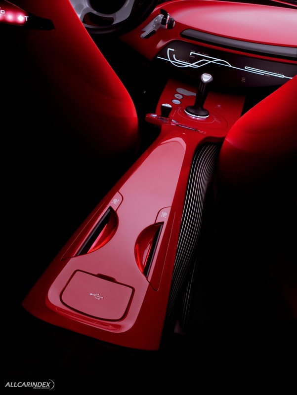 The futuristic, ethereal dashboard features expressive, flowing lines and can be divided into two distinct sections: the red lacquered main structure and black nubuck inserts which can hold small items. This embedded zone houses the sophisticated instrumentation which takes its inspiration from aviator-style watches, including a speedometer which displays the speed in analogue form on the periphery and in digital form in the centre, plus an analogue rev-counter. Both feature black metallic backgrounds with white graphics and red backlighting.