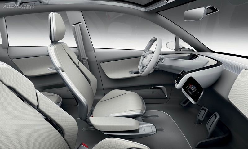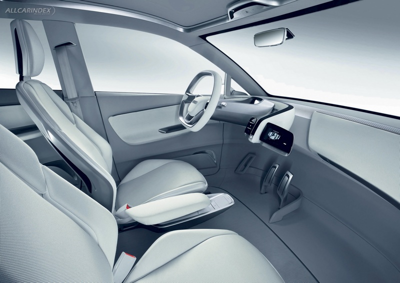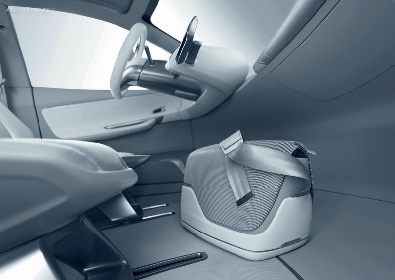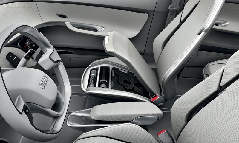 The Audi A2 concept has a flat interior floorboard. The center console is attached to the driver's seat; the rear console extends forward between the two rear seats. The four individual seats add lightness, and there is storage space under the fold-up seat cushions. There is room between the rear seats for a city bicycle with its front wheel removed. The load area has two levels; a frame with functional nets creates the upper level.
