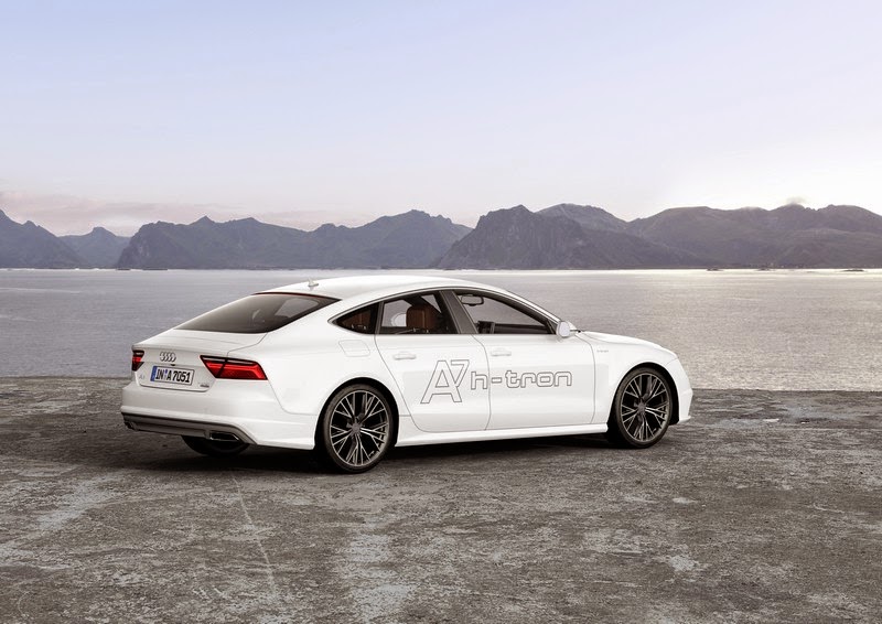 It sprints from 0 to 100 km/h (62.1 mi) in 7.9 seconds and on to a top speed of 180 km/h (111.8 mph). It covers over 500 kilometers (310.7 mi) on one tank of fuel – and its exhaust emits nothing more than a few drops of water: The A7 Sportback h-tron quattro, which Audi is unveiling at the Los Angeles Auto Show 2014, uses a powerful, sporty electric drive with a fuel cell as its energy source that operates in combination with a hybrid battery and an additional electric motor in the rear. The overall electrical system power of 170 kW is transferred to both the front and the rear wheels. This drive configuration makes the emission-free Audi A7 Sportback* a quattro through and through – a new departure in fuel cell cars.