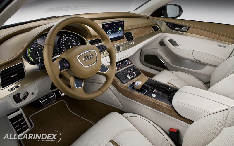 This near-production concept car has 21-inch, two-colour wheel rims styled with highly three-dimensional surface areas. The exterior paint job of the A8 hybrid is in “Prism Silver” with “Spectra Flair” as an accent color – a rainbow effect that’s accentuated in reflected light along creases and seams on the body.
