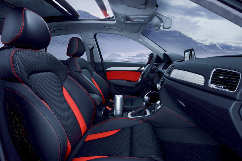The interior of the Audi Q3 Vail has a fittingly sporty black, grey and red colour scheme. The headlining is made from titanium grey Alcantara; large parts of the interior, including the carpet, are black. The black, ribbed floor mats are edged with narrow strips of red velvet-finish leather.