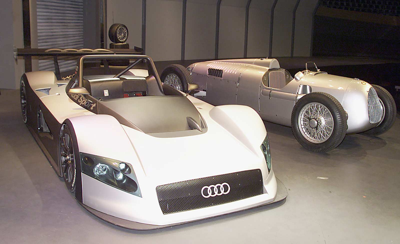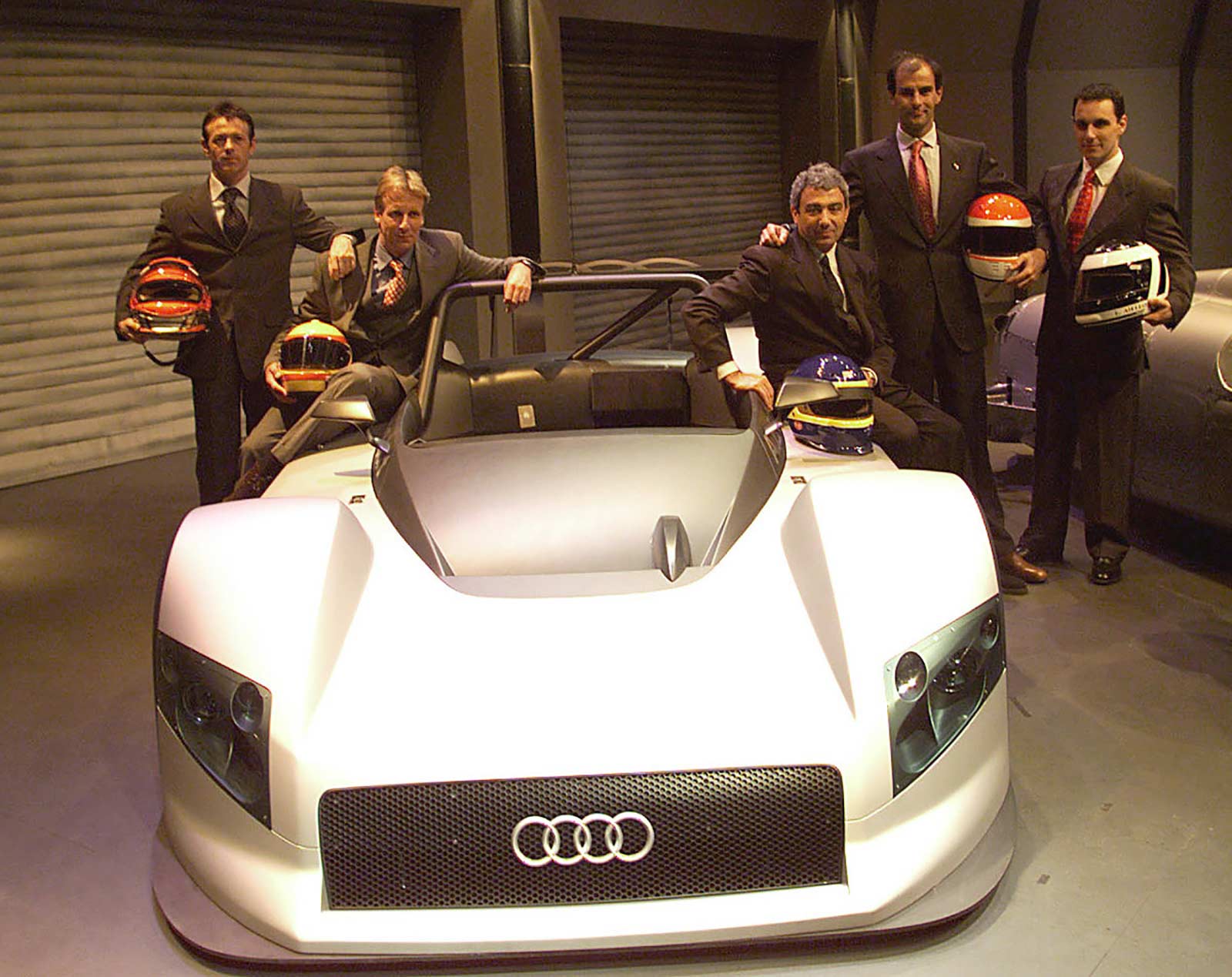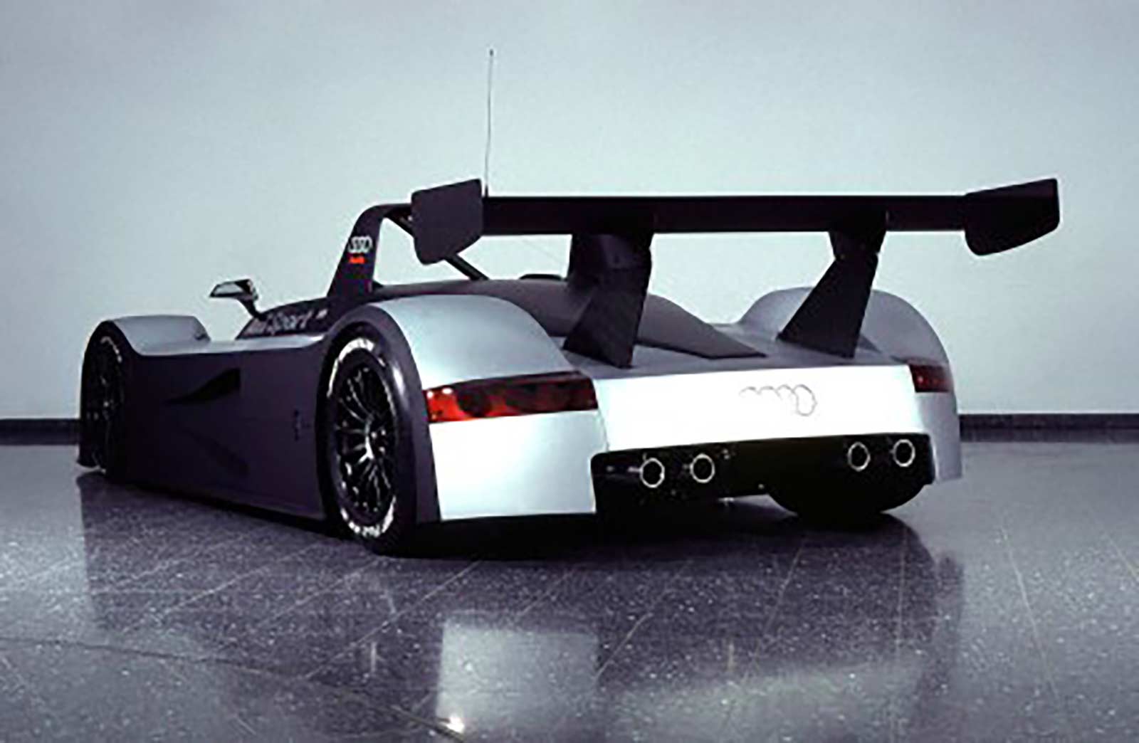 In 1998, the R8R was unveiled to the press as a conventional yet stylish car featuring front-mounted water cooling, flank NACA ducts for intercooling, top side pod NACA ducts for turbo intake, a Kamm-ish tail, and a single element Le Mans configuration rear wing. While initially appearing aesthetically pleasing, it lacked some functional elements like a rear diffuser and had non-race car features such as four sets of exhaust pipes. Designed by Audi stylists Luc Donckerwolke and Roland Heiler, it served as a test bed for mechanical components and further developments of the R8R series during initial testing.