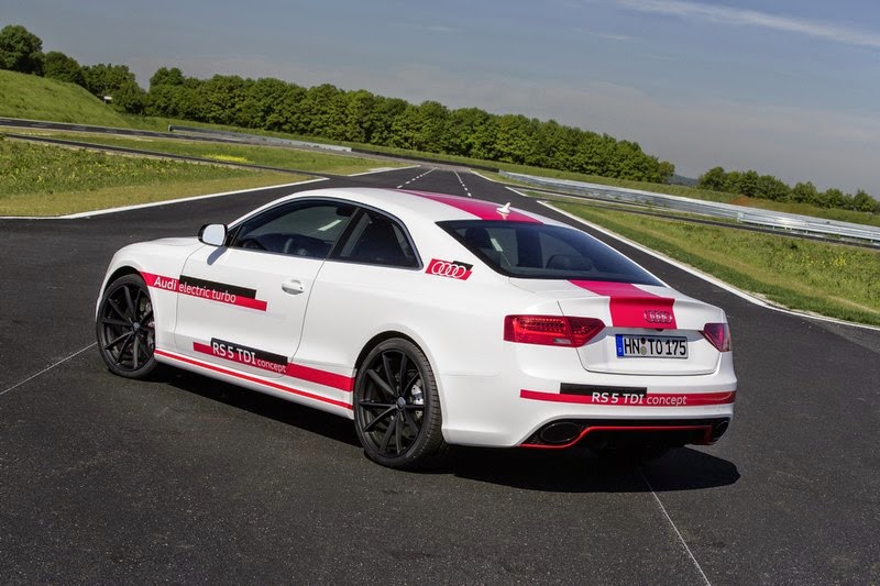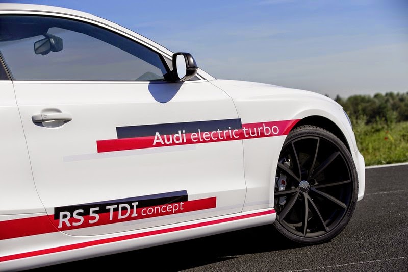 The V6 biturbo in the Audi RS 5 TDI concept produces 283 kW (385 hp); from 1,250 to 2,000 rpm it transfers 750 Nm (553.2 lb-ft) of torque to the crankshaft. The red-line is at 5,500 rpm. The supplemental electric turbocharger provides for staggering power when starting off. An electric motor replaces the turbine wheel and accelerates the compressor wheel to over 70,000 rpm in a few hundredths of a second. The exhaust turbochargers also provide as much as 2.4 bar of relative boost pressure.