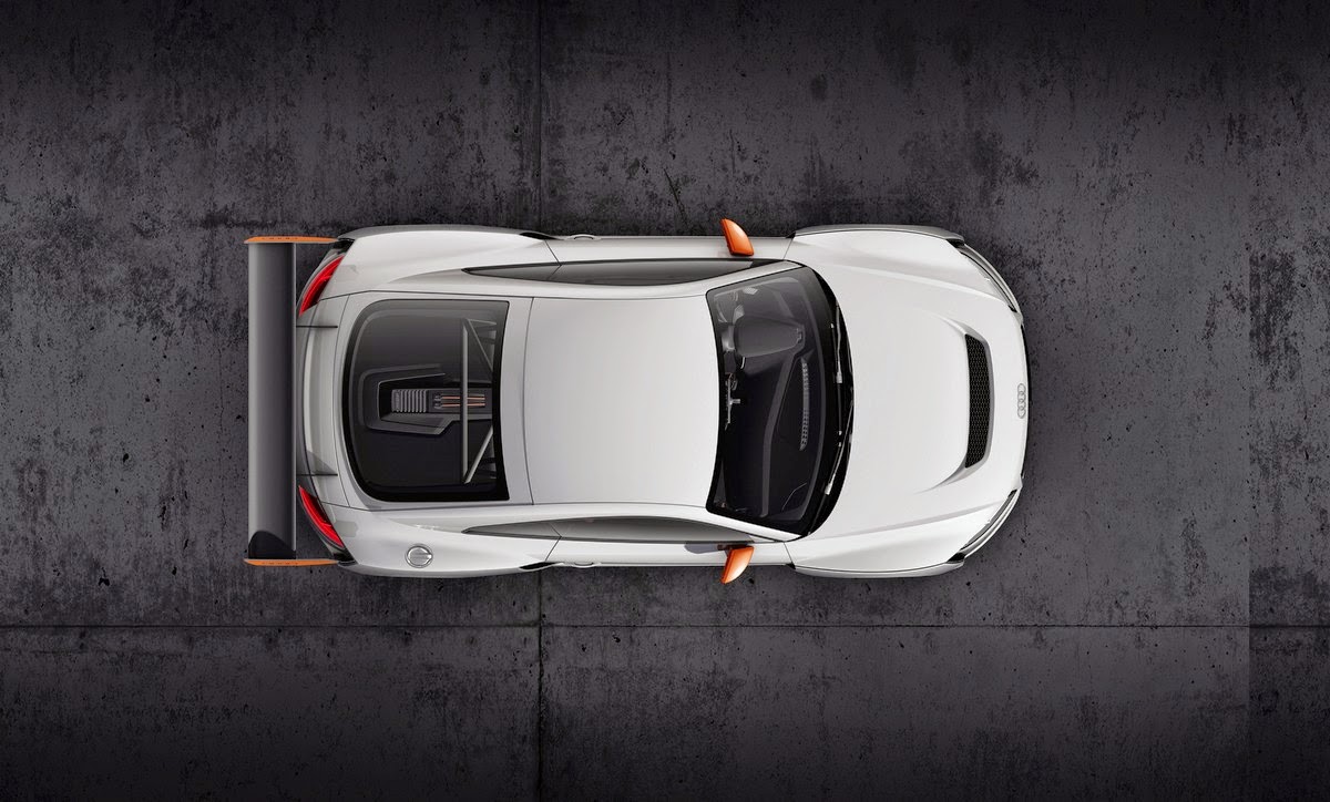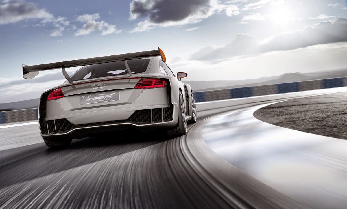 The manually adjustable rear wing is an advanced development of the Audi Sport TT Cup with which the brand very recently launched a dedicated race series. It is now 20 cm (7.9 in) wider, and the side flaps, which feature the four rings, were given a new geometry. The wing consists of carbon-fiber reinforced polymer (CFRF) as do all other add-on parts: the air inlets and the large splitter at the front, the side panels and side sill trims as well as the voluminous diffuser at the rear whose lateral segments reference the motif of the air inlets.
