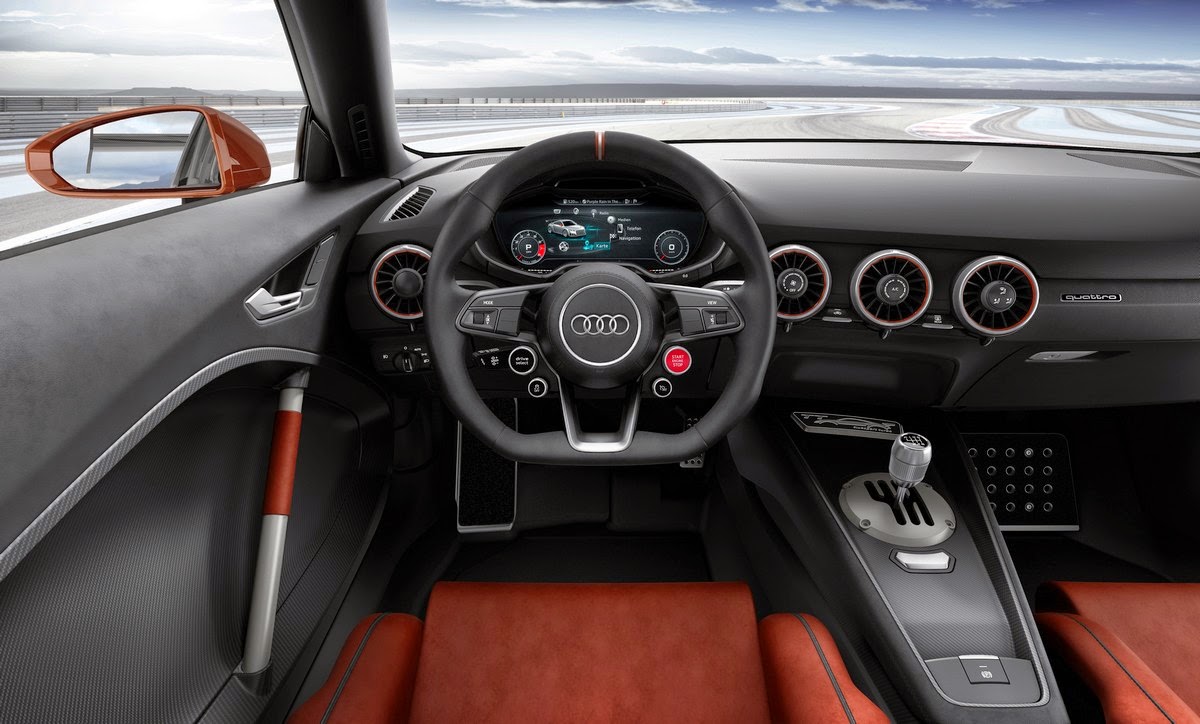 The compact sports car takes a full stance on the road with track widths of 1,736 mm (68.3 in) in front and 1,729 mm (68.1 in) at the rear. The car is 4.33 meters (14.2 ft) long and 1.97 meters (6.5 ft) wide, including the side mirrors – 14 cm (5.5 in) wider than the technical platform upon which it was based. Its angular fenders contribute a separate additive shape to the car body. They take the characteristic design motif of the Audi TT* to an extreme and accentuate the distribution of engine power to all four wheels – the quattro drive. The fenders of the show car – painted in the exterior color Ferro Titanium – are open at the front and rear. Air from the car’s slipstream flows through them to cool the brakes. The Singleframe grille and large air inlets – whose vertical fins form a continuation to the light signature of the Matrix LED headlights – are also optimized for maximum air throughput.