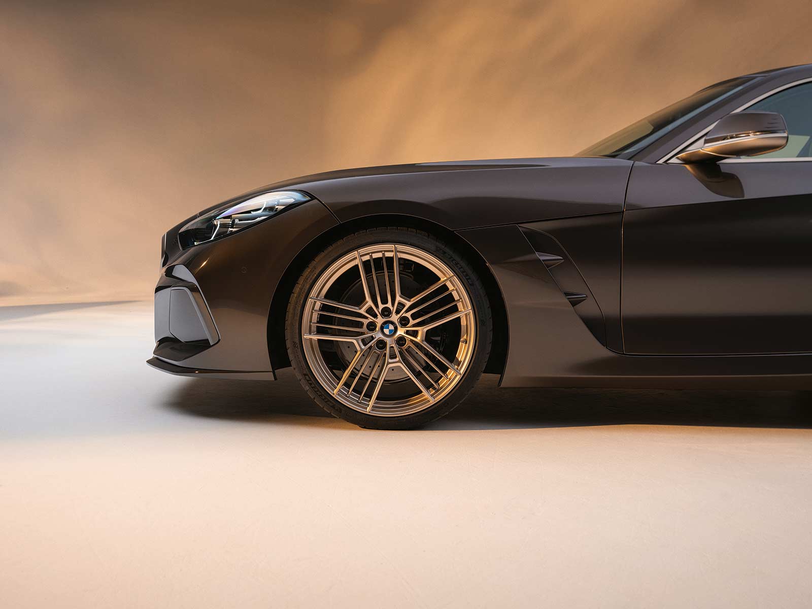 The Sparkling Lario exterior paintwork was specially created for the BMW Concept Touring Coupé. With embedded flakes of blue glass, its grey-brown hues achieve a unique impression of depth. The effect is completed by silver-bronze accents and the specially designed BMW kidney grille with longitudinal bars. The exclusive light-alloy wheels, measuring 20 inches at the front and 21 inches at the rear axle, provide a logical continuation of these colour accents in the 20-spoke radial design. The intricate implementation and discreet gold-coloured surfaces underline the vehicle’s elegant sporty character.