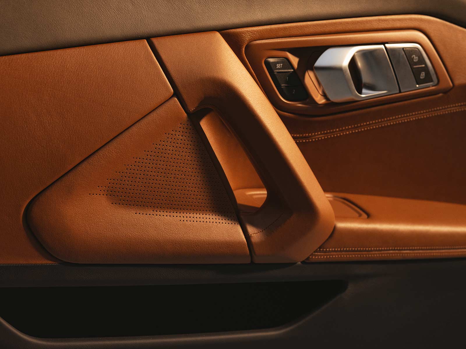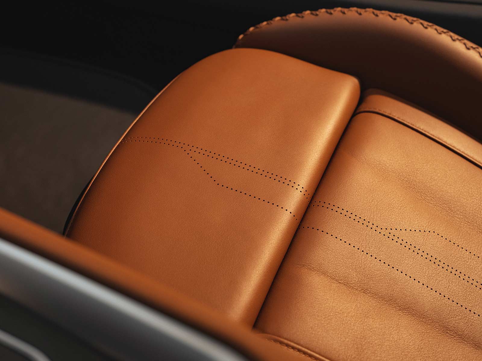Precise perforations, as well as braided leather straps for the seat valences and slide bar, highlight the artisan character of the interior, which combines traditional craftsmanship at the highest level with modern design principles.
