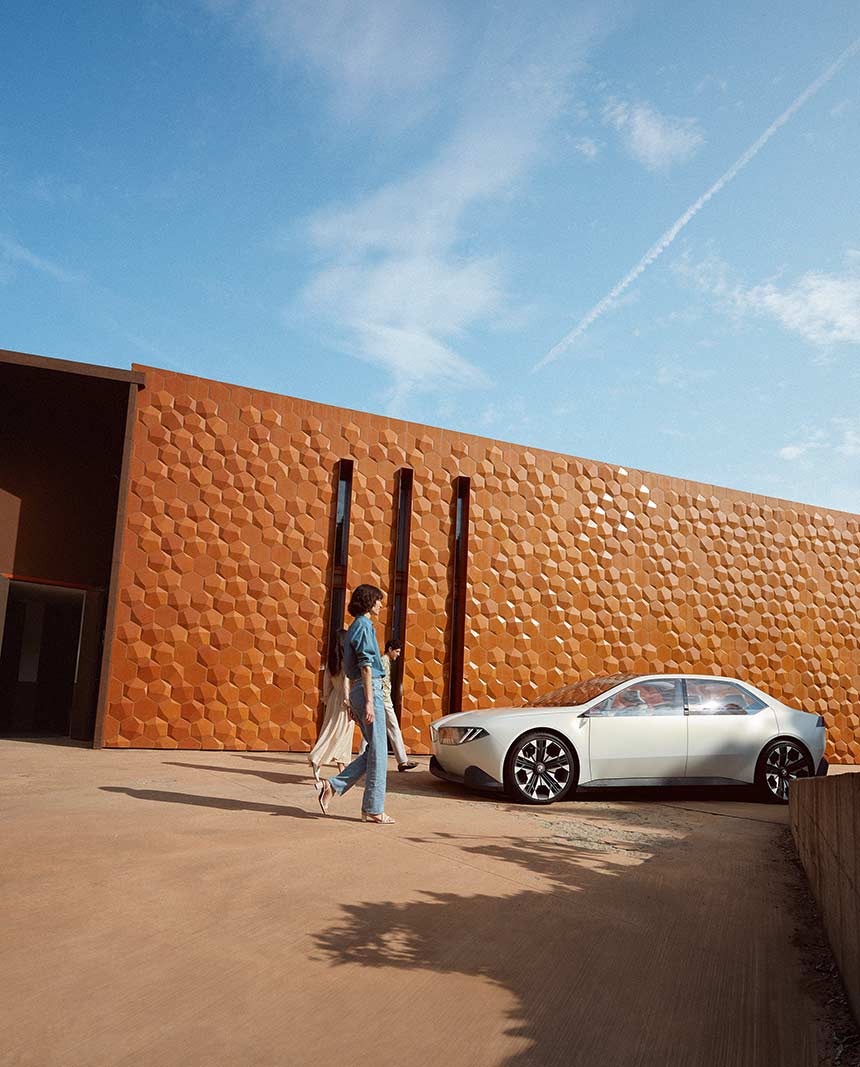 A fresh interpretation of the brand's signature design elements, like the BMW kidney grille and double headlights, transform the vehicle’s front-end into a single interaction area. A lighting effect with precise three-dimensional animation initiates intuitive interaction between the human and their vehicle as soon as they approach the car. E Ink elements in the lower portion of the side windows also feature in the exterior welcome scenario, directing attention to the sensor area that activates automatic door opening. Innovative technology similarly defines the design of the rear lights, with 3D-printed light elements that extend over several levels and are controlled in a targeted manner to create a unique impression of depth.