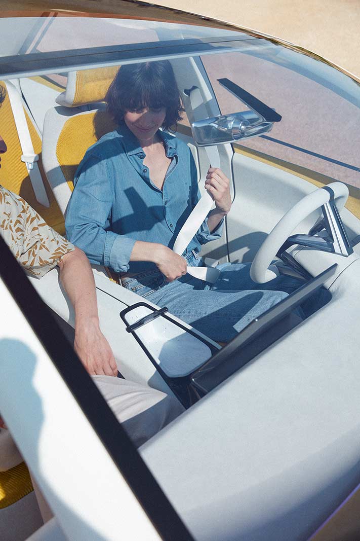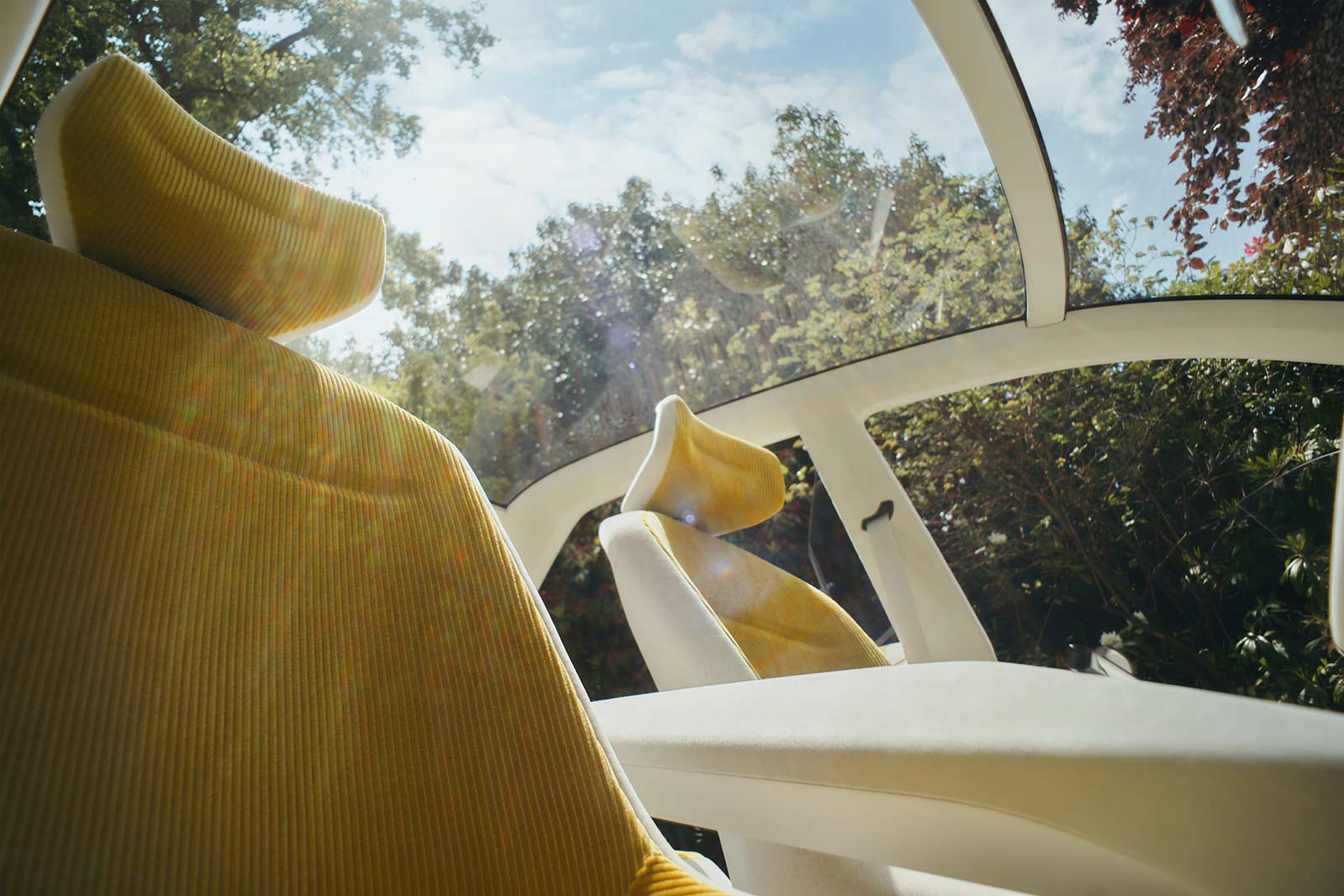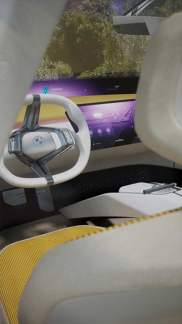 Bright cord fabrics create a comfortable atmosphere inside the BMW Vision Neue Klasse. The light-coloured instrument panel supports the steering wheel, which is flattened at the top and bottom, as well as the Central Display with Matrix-Backlight in the outline of a parallelogram. A smartphone charging cradle and the glassy selector lever space on the centre console. The front seats are attached to the floor by a single bracket, freeing up additional legroom in the rear compartment, where passengers can enjoy the spaciousness created by having two individual seats. The design of the interior, which is completely free of decorative chrome or leather, helps optimise the carbon footprint of the production process.