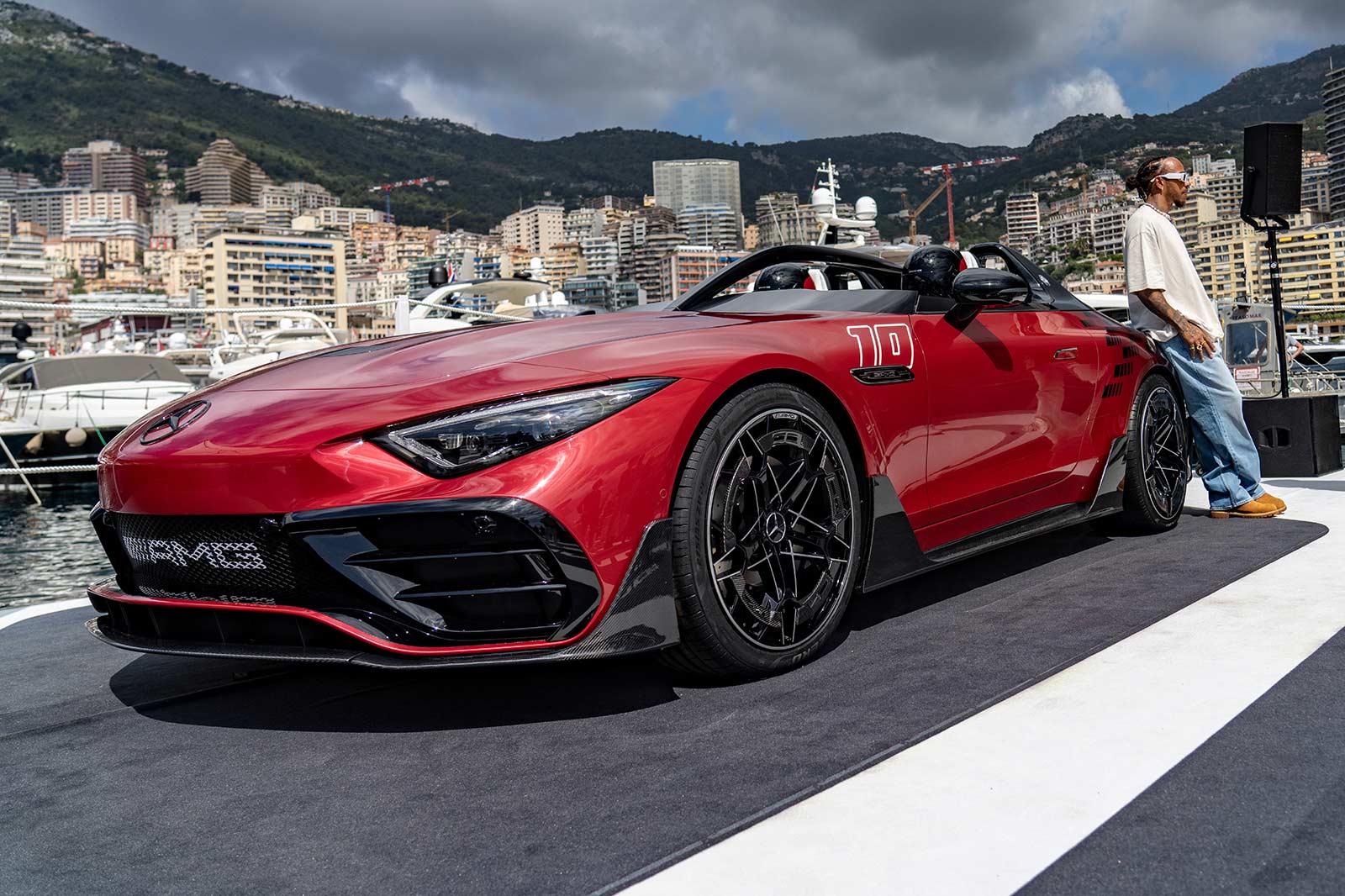 Affalterbach. Exciting, energising and breathtaking – the Mercedes‑AMG PureSpeed concept is the highlight in the run-up to the Formula 1™ Monaco Grand Prix. The radical design of a completely open, two-seater performance car without a roof or windscreen is a tribute to motor racing. The concept car provides a preview of the first model in the highly limited Mercedes-Benz Mythos series. The world premiere of the Concept Mercedes‑AMG PureSpeed took place in an exclusive setting on the sidelines of the Formula 1™ Monaco Grand Prix. The vehicle was unveiled on a floating pontoon in the harbour of the principality and also impressed Mercedes-AMG PETRONAS F1 Team racing drivers Lewis Hamilton and George Russell.