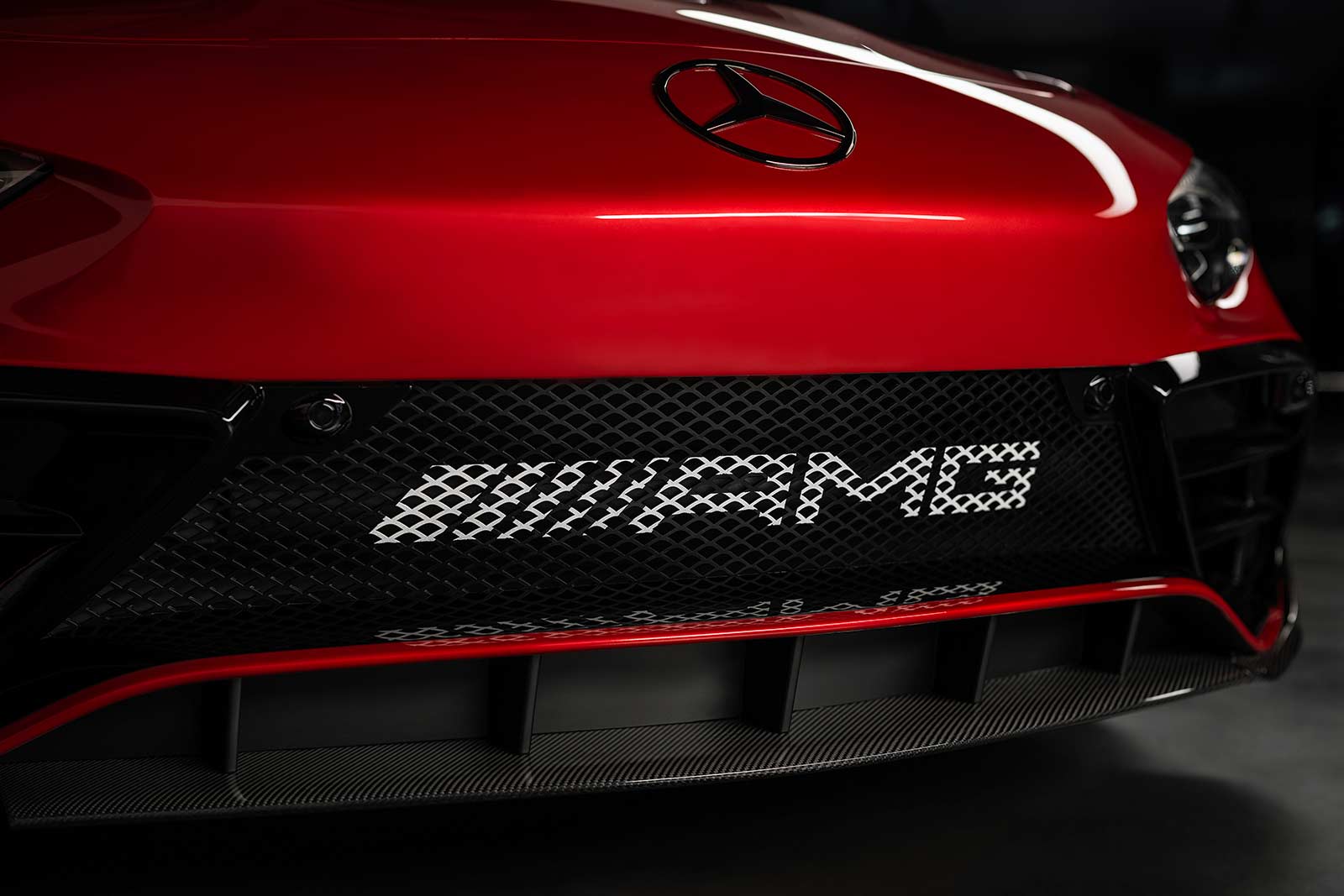 Typical of a sports car are the long bonnet and the very low front end with a pronounced “shark nose”. The front design is similar to the Mercedes‑AMG ONE with a wide lower air intake with AMG lettering and a dark, chrome-plated Mercedes star on the soft nose. Added to this is the aerodynamically optimised, sportive bonnet with an additional air outlet. Small, transparent deflectors at the front and sides direct the wind over the cockpit.