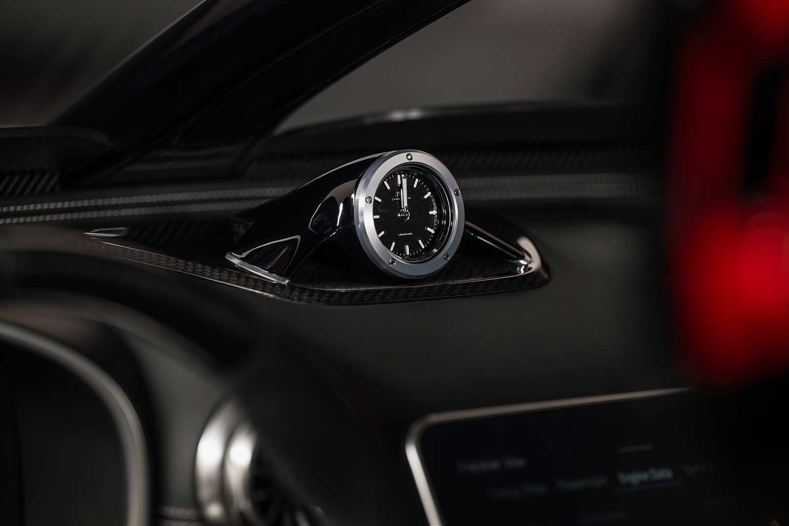 One highlight is the HALO system which replaces the conventional A-pillar on the vehicle. This element is a direct derivative of the premier class of motorsport and has been part of every Formula 1™ vehicle since 2018. It protects the driver's head in the event of an accident. The name HALO describes its shape. As in Formula 1™, the safety system in the Concept Mercedes‑AMG PureSpeed consists of a bracket that is connected to the body of the vehicle. This aerodynamically optimised component serves to protect the occupants, just as in Formula 1™. Included are two aerodynamically optimised helmets specially designed and manufactured for the Concept Mercedes‑AMG PureSpeed. The field of vision as in Formula 1™ thus becomes a reality for two people. Neither roof, windscreen nor side windows separate them from their surroundings. The interior adds further highlights, with its unique colour and equipment concept as well as a custom clock designed by IWC Schaffhausen on the dashboard.