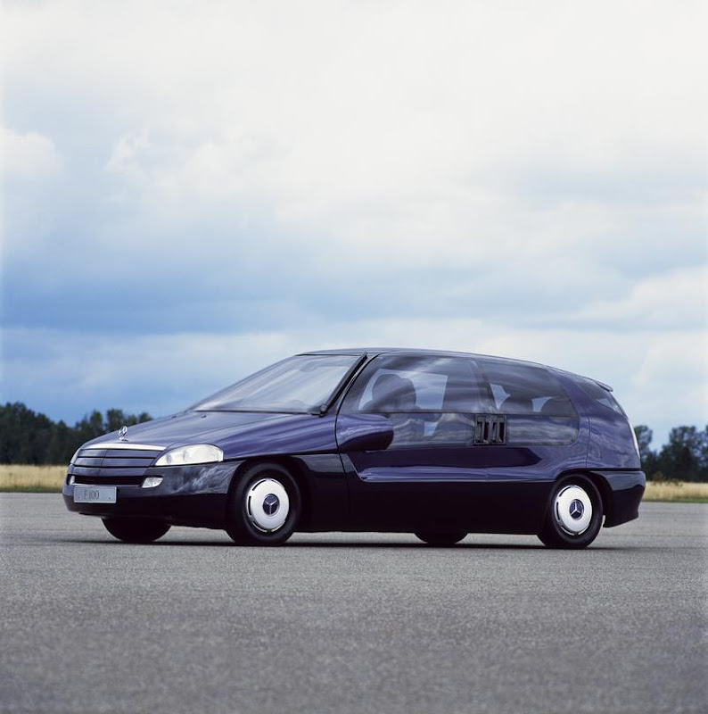 Different engine concepts were examined in the F 100, including a modified internal combustion engine operating on hydrogen. The vehicle has front-wheel drive – a novelty for a Mercedes-Benz at the time. It rolls on CTS (Continental Tire System) tires with flat-running properties, and tire pressure is electronically monitored. The suspension features hydropneumatic auxiliary spring elements, enhancing comfort and handling safety. In the F 100 the first sandwich floor was realized; this feature made it to large-scale production in the Mercedes-Benz A-Class at a later stage. In a crash, the engine – guided by the sloped firewall – slides downward underneath the passengers to protect them.