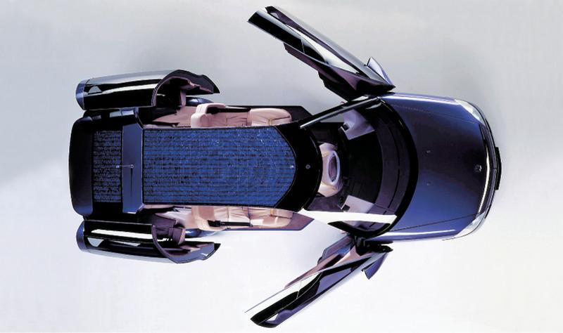 Solar cells are integrated in the roof to support the batteries. Almost two square meters in area, they generate an output of 100 watts, which, among other things, furnishes power for the ventilation when the car is stationary and thus keeps temperatures at a pleasant level. With a car phone including voice control, mobile fax and a personal computer, the F 100 anticipated the communication and work options of later production vehicles.