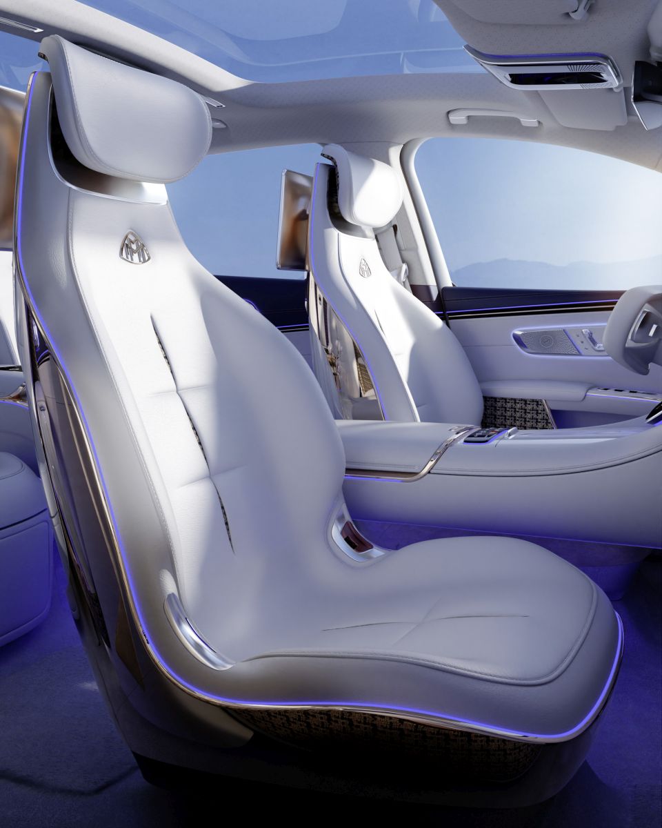 The interior of the Concept Mercedes-Maybach EQS is just as emotional and stylish a statement as the exterior – realised completely virtually. The lounge character promises luxurious travel at the highest level. The front seats show parallels to the Mercedes-Maybach S-Class. The First-Class rear suite with two generous individual seats – also inspired by the S-Class – as well as the High-End Rear Seat Entertainment System guarantee the highest level of comfort on board. And because the SUV concept allows for more seat height, the calf rest could be made even larger. It lets the passenger’s feet float above the “faux fur” floor covering.