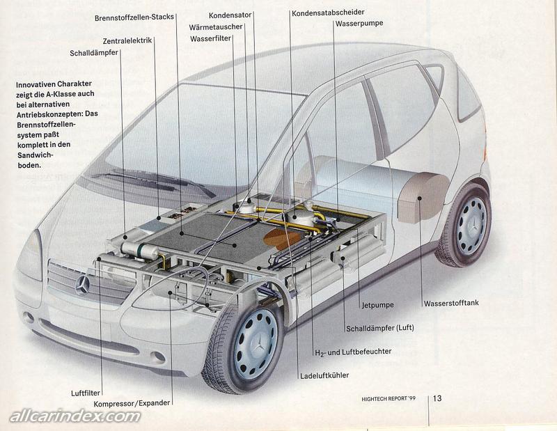 DaimlerChrysler engineers first succeeded in making the fuel-cell drive so compact that it would fit into the sandwich-construction floor of the A-Class in 1999, when the 70-kW NECAR 4 came out. Powered by liquid hydrogen, this latest model had a top speed of 145 km/h and could drive for 450 kilometres on a single tank of fuel, while it also had enough room for five people plus luggage. The NECAR 4a was specially built to be used in the fleet test carried out by the "California Fuel Cell Partnership". The drive technology was basically the same as that seen in the NECAR 4 but it had been redeveloped to run on compressed hydrogen, making it much more compact.