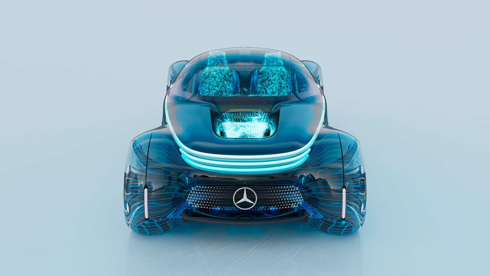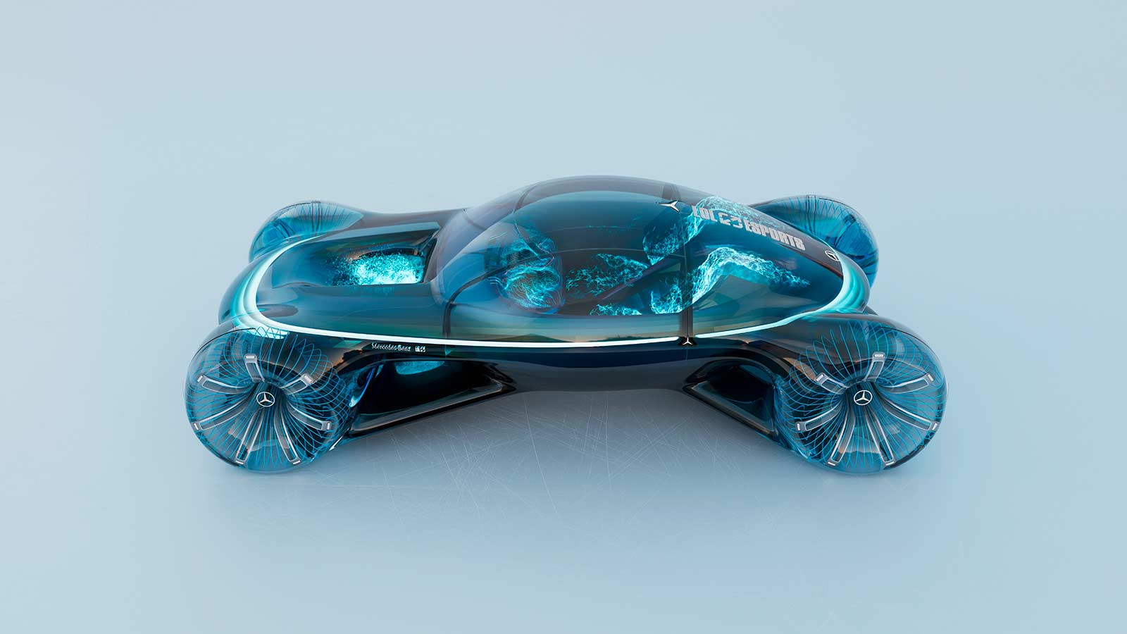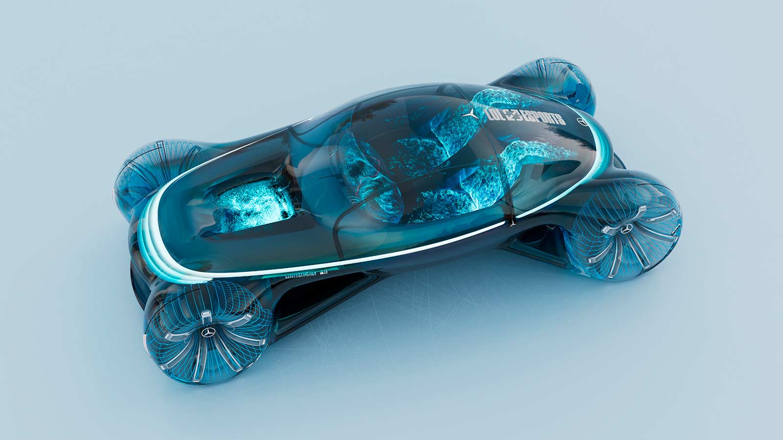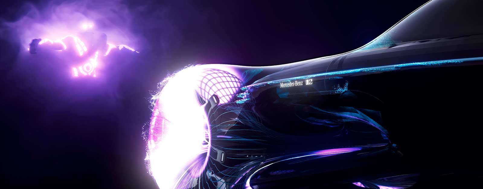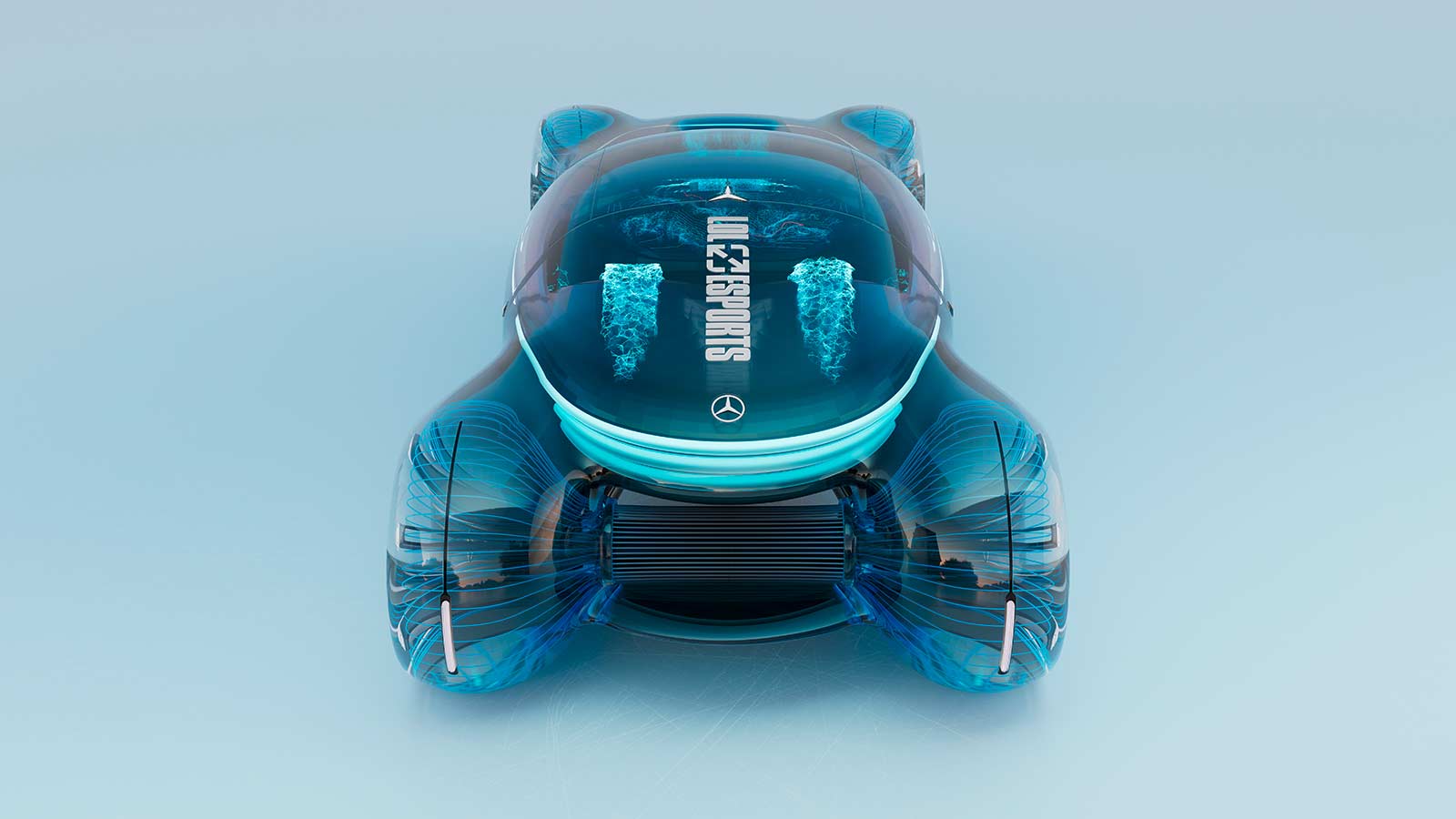 Project SMNR embodies the Mercedes‑Benz’s design philosophy of Sensual Purity. The showcar combines beauty with the extraordinary in a unique way. Due to the purely virtual environment, the design is free from production constraints and the laws of physics. The resulting use of completely new materials, known as ‘metamaterials’, pushes the limits of what is possible. For example, the two-seater vehicle has a dynamic silhouette with a centrally located driver’s cockpit and increased ground clearance. The wheels in the conventional sense have been replaced by energy fields and are fluidly integrated into the overall design of the vehicle. The flexible energy fields make it possible to completely dissolve the axles and bring their absence into focus. In addition, the spokes run inwards and accentuate the sculptural axle tunnel. In combination with the noticeably short rear section, this enhances the showcar’s powerful and energetic appearance. In places where one would expect supporting structures or solid materiality, the design surprises with bioluminescent energy particles and flowing structures. The vehicle design was inspired by the world of gaming in general and LoL Esports in particular. It is based on two unique elements: the ‘Energetic Core’ and the ‘Zoning Molecules’.