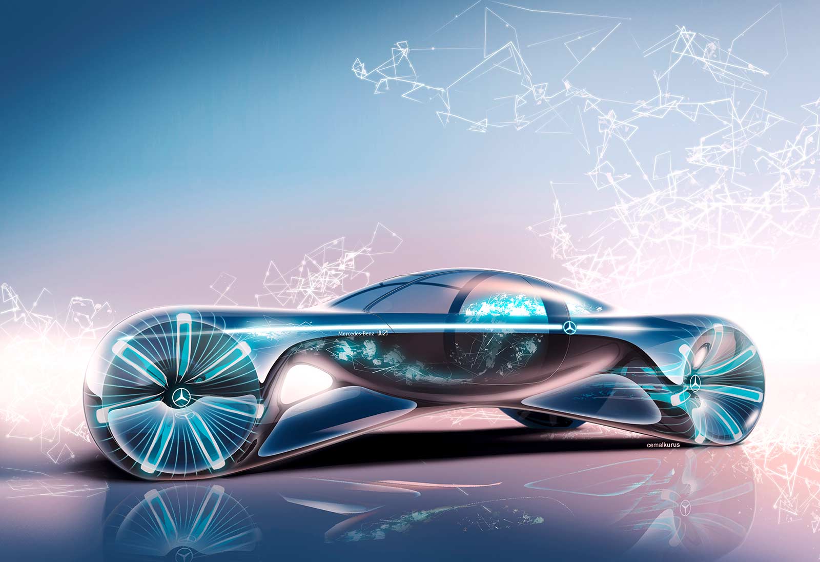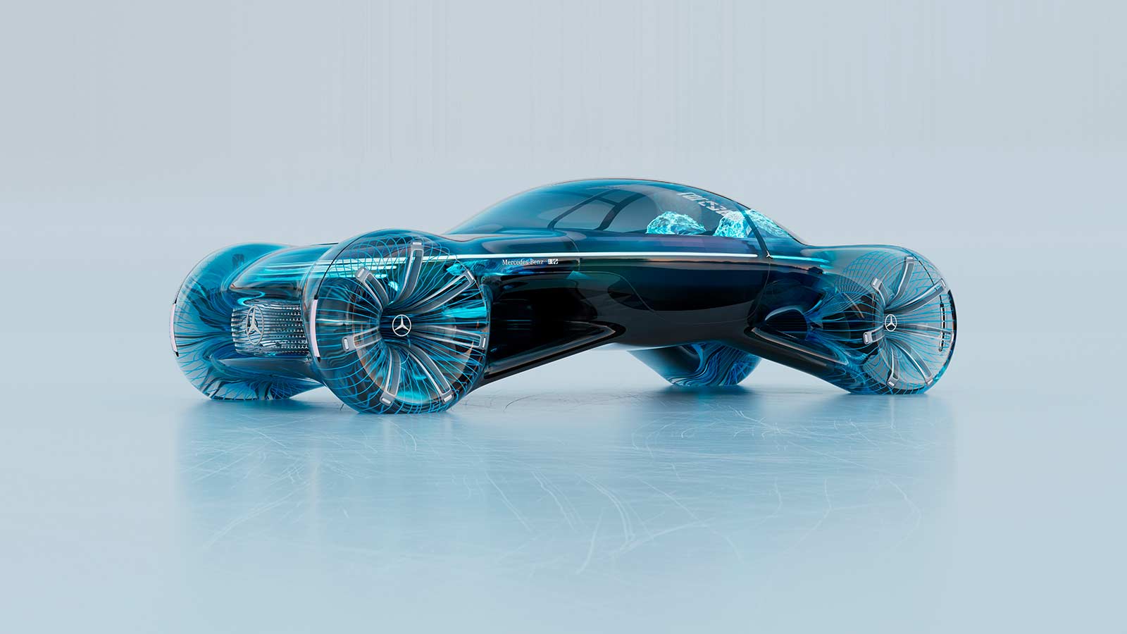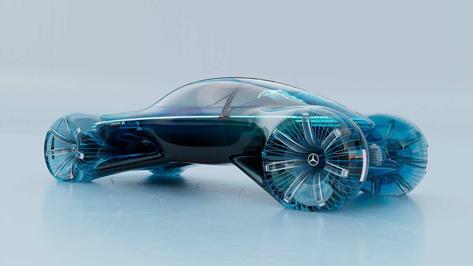 - Boundless design possibilities in virtual space allowed for the design of a sculptural two-seater coupé, which is characterized by its semi-transparent materiality