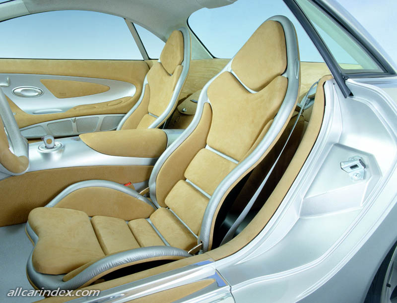The interior as shown in the study is dominated by the wide, gently curved central console with its round controls as well as the silver-painted spoiler shape in front of the driver and front passenger. They replace the usual instrument panel while symbolizing the modern, light-weight construction of the Gran Turismo. The cockpit consists of two round aluminum-rimmed instruments which recall expensive chronometers. Carbon (carbon fiber) bucket seats, an oval steering wheel and highly modern information systems such as the Cockpit Management and Data System (COMAND) are included in the additional special features of the sporty interior.