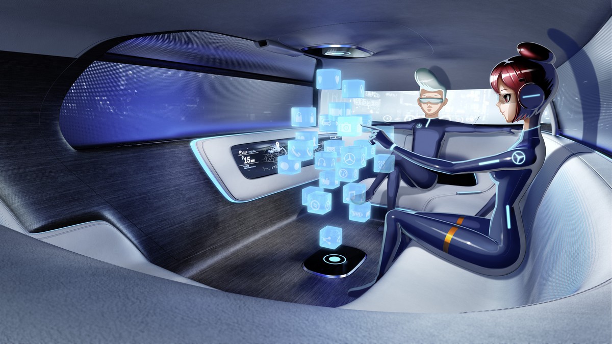 Behind the passengers are large wraparound LED screens. The perforated seats are back-lit, giving rise to a high-tech ambience that presents an intentional contrast to the soft surface finish of the pale leather. Apps, maps and displays emanating from the entertainment system are presented as three-dimensional holograms within the interior space.