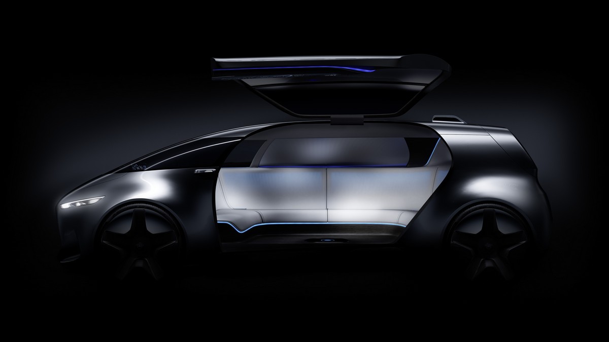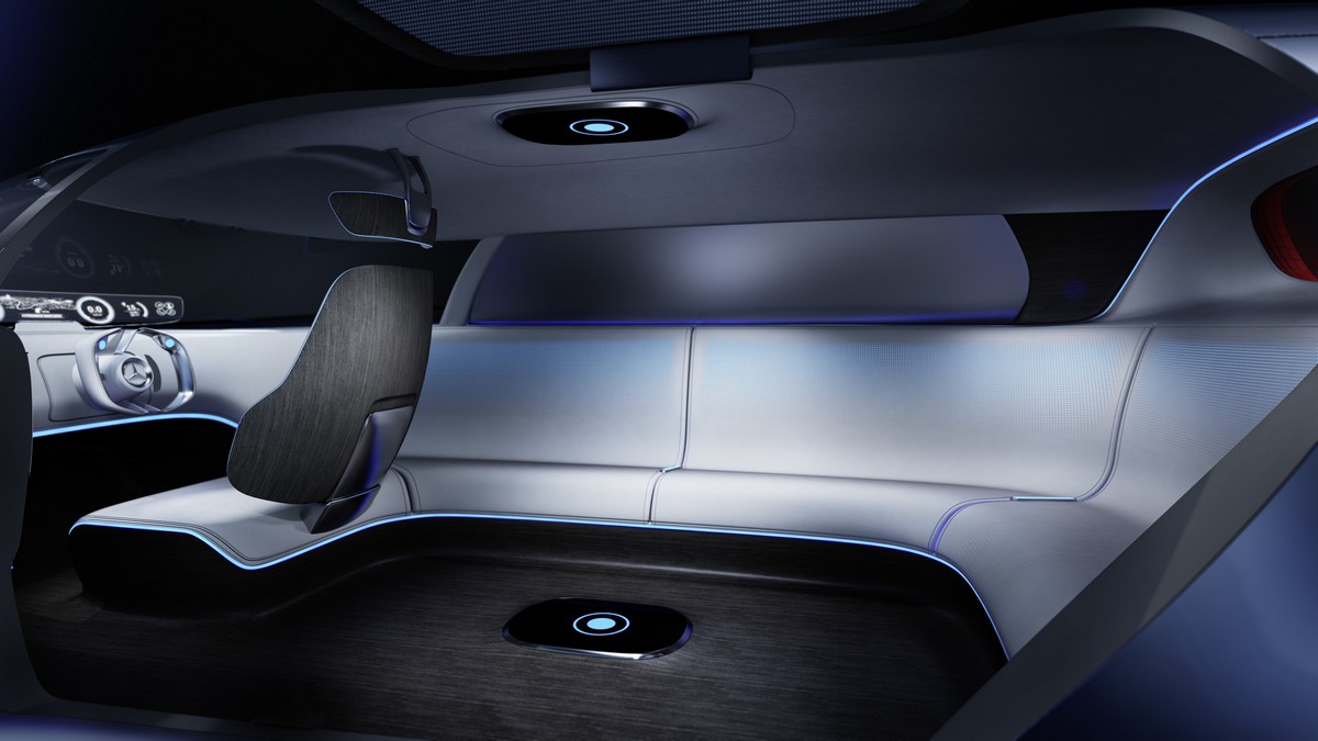Surfaces and lines illuminated in blue – among them the 26-inch wheels and the side skirts – provide unexpected colour highlights and are indicative of the concept car's emission-free electric drive system. A pointer to the potential for autonomous operation and the comprehensive system of vehicle environment sensors that this requires, including a 360-degree camera, is provided by the fin on the vehicle roof.