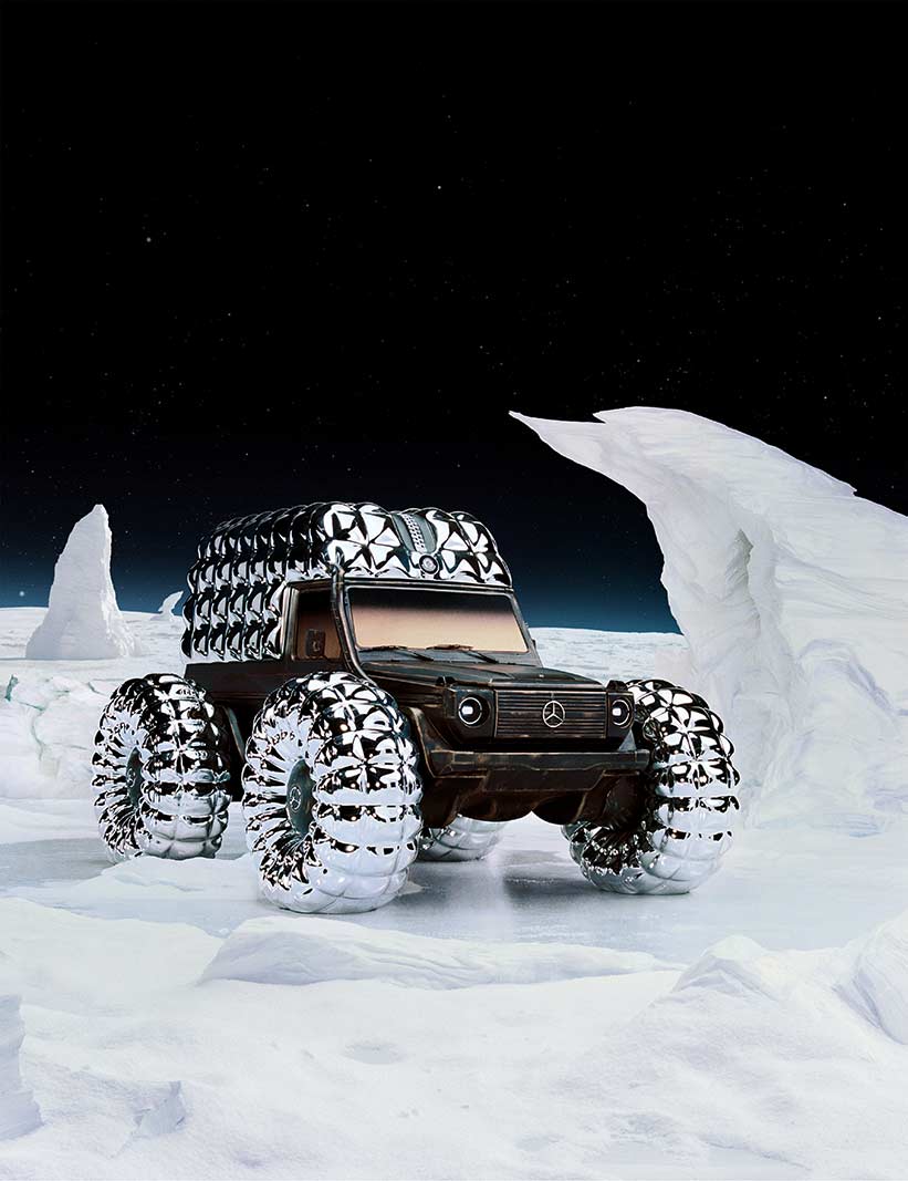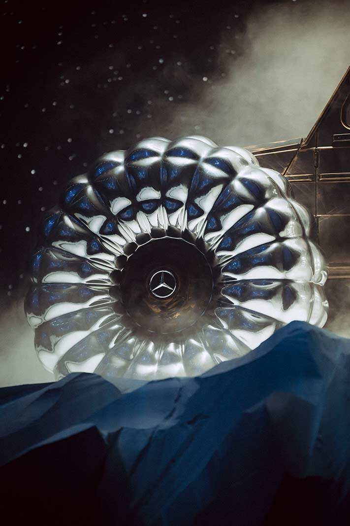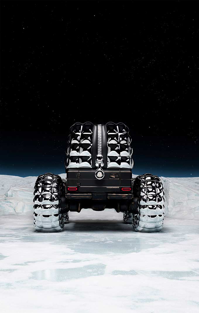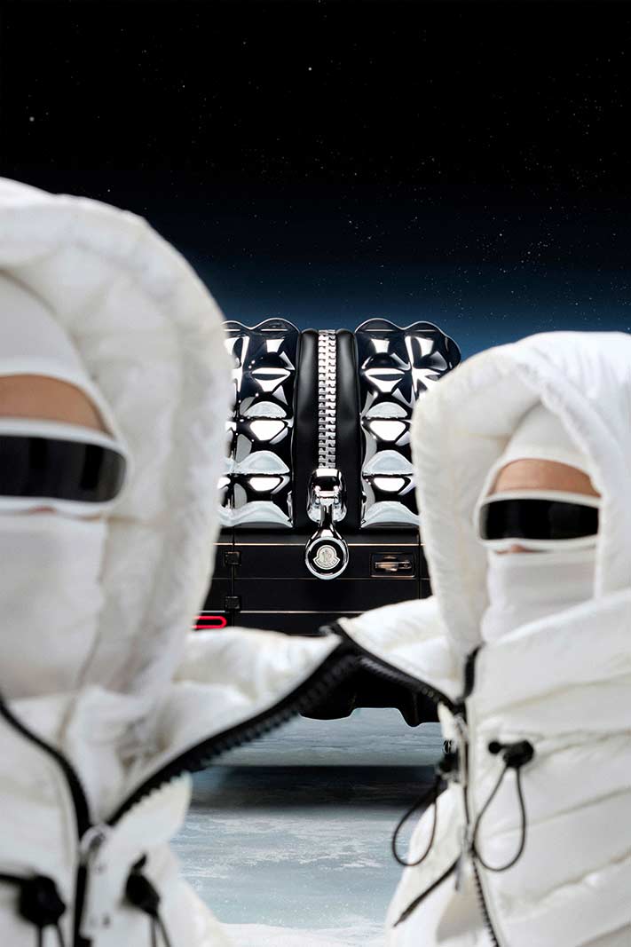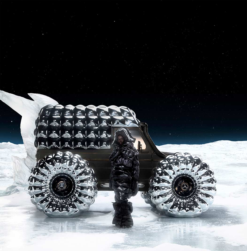 PROJECT MONDO G is the hero showcar of the campaign that accompanies the Mercedes-Benz and Moncler co-creation with social media, out of home (OOH) and PR assets for a broad global activation. The visualization stages an otherworldly winter landscape inspired by the main themes of outdoor durability and limitless discovery opportunities with the off-roader G-Class as basis of PROJECT MONDO G and the puffer jacket of Moncler. The look and feel is an imaginary universe with low gravity that interprets the art piece with fashionable moments by models wearing conceptual looks designed with Moncler collection items. The campaign set design mirrors the art piece reveal at the “The Art of Genius” show presenting the ability of the G-Class and the Moncler puffer jacket to withstand even in the harshest conditions. The campaign was lensed by the recognized director and photographer Thibaut Grevet.