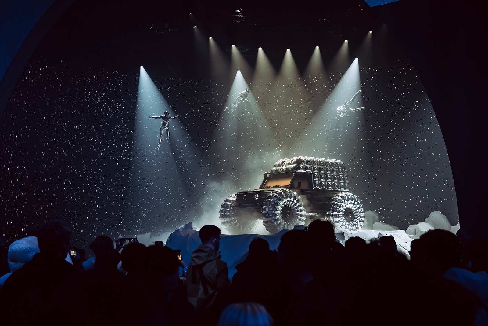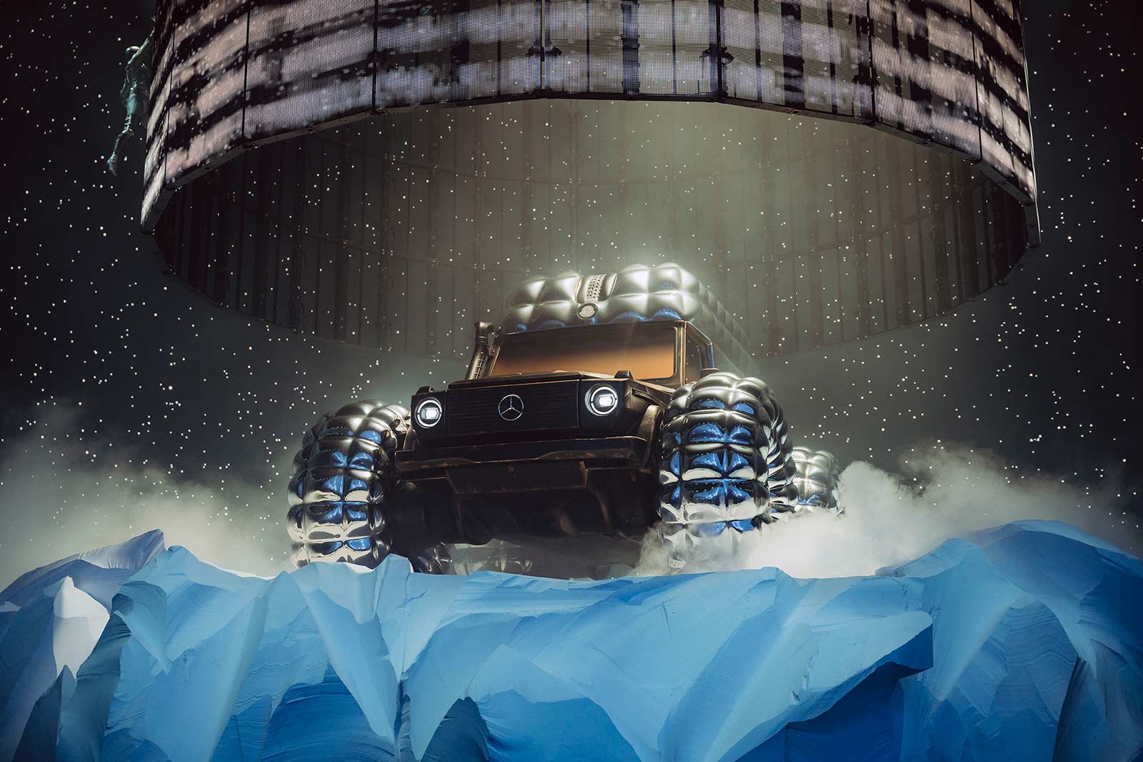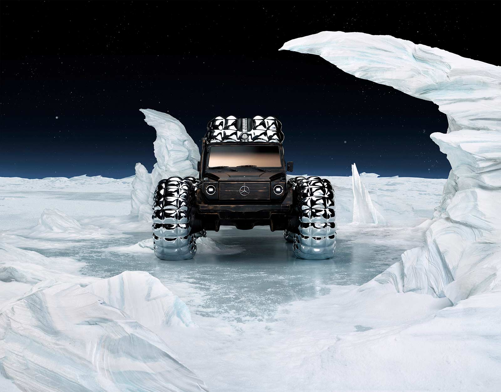 PROJECT MONDO G is the hero showcar of the campaign that accompanies the Mercedes-Benz and Moncler co-creation with social media, out of home (OOH) and PR assets for a broad global activation. The visualization stages an otherworldly winter landscape inspired by the main themes of outdoor durability and limitless discovery opportunities with the off-roader G-Class as basis of PROJECT MONDO G and the puffer jacket of Moncler. The look and feel is an imaginary universe with low gravity that interprets the art piece with fashionable moments by models wearing conceptual looks designed with Moncler collection items. The campaign set design mirrors the art piece reveal at the “The Art of Genius” show presenting the ability of the G-Class and the Moncler puffer jacket to withstand even in the harshest conditions. The campaign was lensed by the recognized director and photographer Thibaut Grevet.