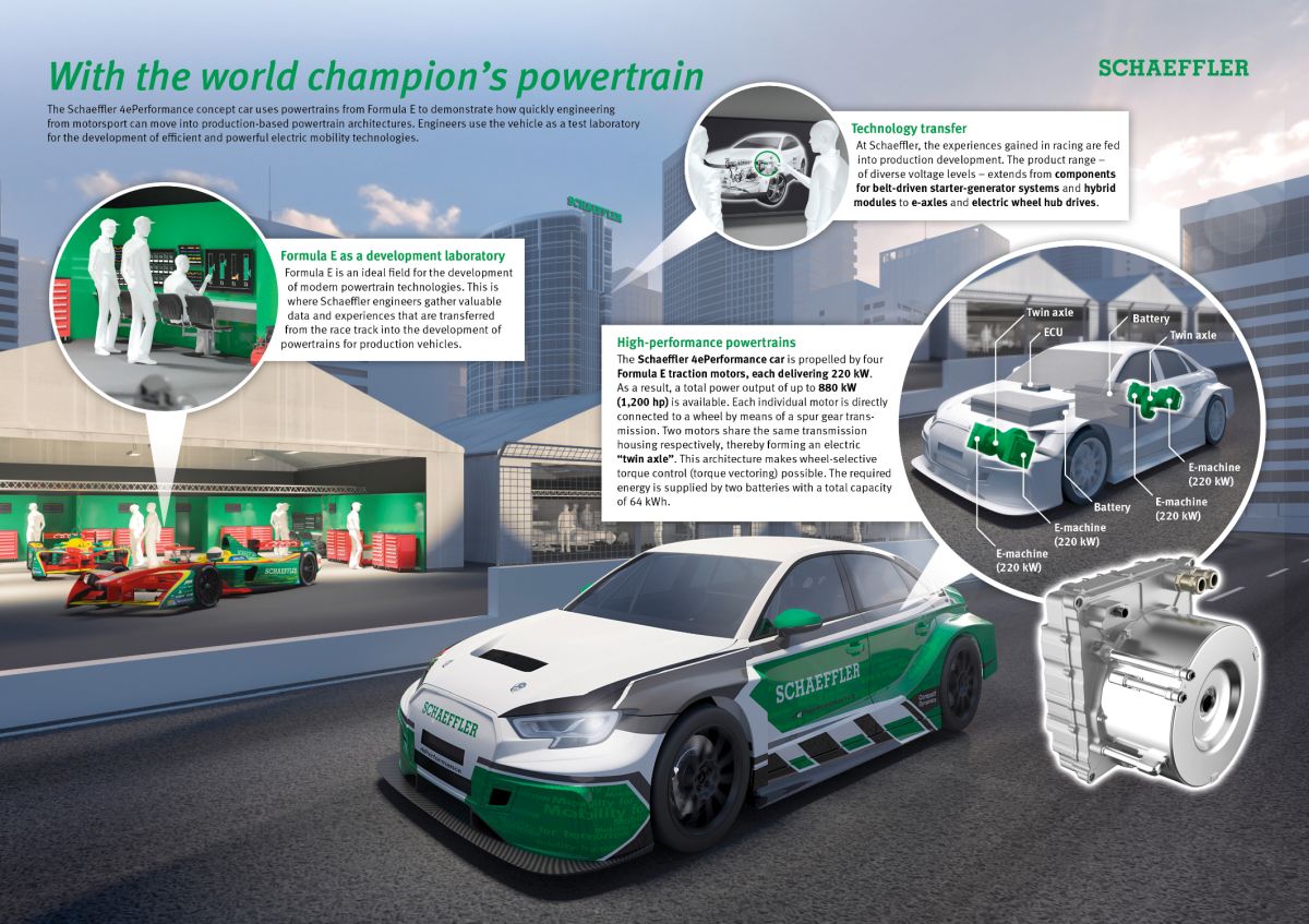 “In the same way as Schaeffler has contributed its technical expertise to Formula E from the very beginning, it also plays a pioneering role and is a partner for components and complete system solutions when it comes to applying electric mobility to volume production vehicles and putting them on the road”, says Prof. Peter Gutzmer, CTO of Schaeffler. The automotive supplier offers a wide range of products for electric mobility and the electrification of the entire drive train: From technologies for 48-volt hybridization and high-voltage hybrid modules that have been tested in volume production through to modular electric axles that will soon also be applied in renowned upper-class electric vehicles in Europe, after first volume-production solutions have been offered in China. “Schaeffler 4ePerformance” could be a supplement to volume-production drive concepts for electric high-performance sports cars.