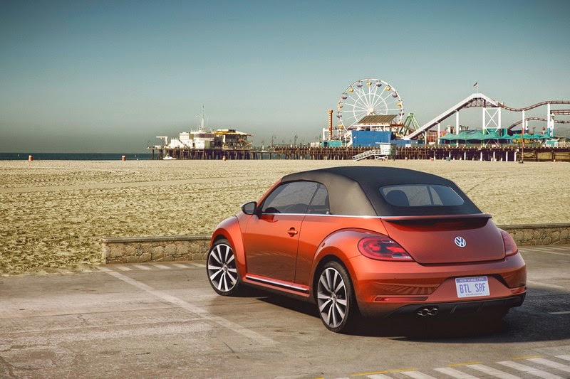 The concept car Beetle Wave in "Habanero Orange Metallic" reflects the American spirit on the East and West coast beaches of the USA. This spirit is also expressed in the convertible's interior. Fabric patterns from the 1950s and 60s influence the design of the center seat panels, and there is a genuine wood dashpad that is designed in traditional surfboard style.