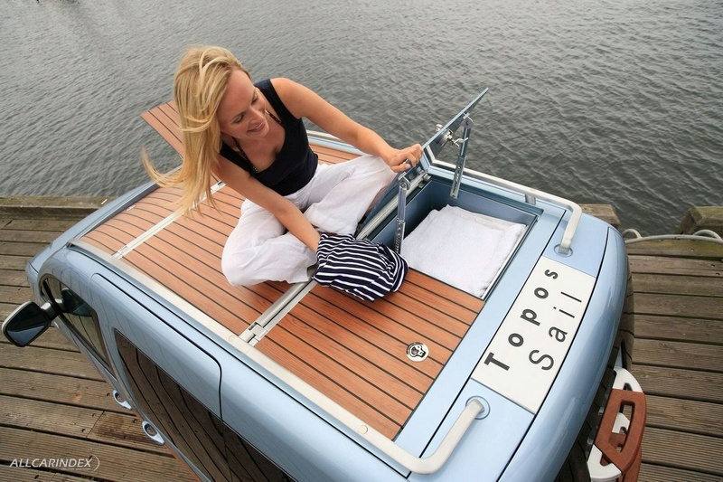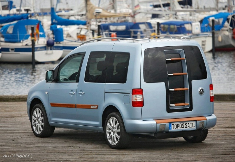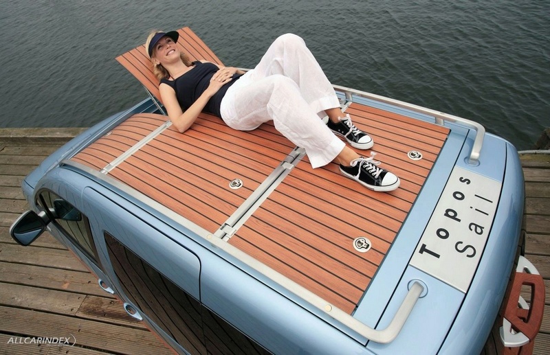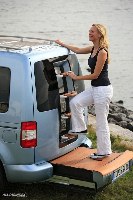 The Caddy Topos Sail design concept, based on the smallest model in the Volkswagen Commercial Vehicle van range, uses design cues from classic yachts and has its multi-functional roof covered with wooden decking surrounded by aluminium roof rails.