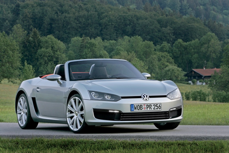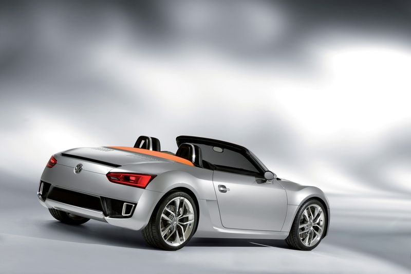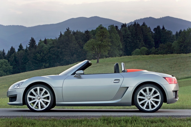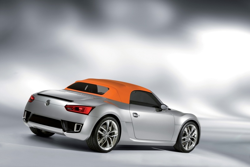 The Concept BlueSport – painted in Flex Silver painted and sporting an orange colored fabric roof – was designed by the team led by Klaus Bischoff (Director of Design for the Volkswagen Brand) and Thomas Ingenlath (Director of the Design Center in Potsdam). "The design of the Concept BlueSport," says Klaus Bischoff, "represents a perfect synthesis of technology and aesthetics. Its form is very clear and is reduced to essentials; the car body itself has a lean and linear structure." Thomas Ingenlath adds: "Emanating powerfully from this car body are the circular wheel housings, flared out in three dimensions as in a sculture. The radial surfaces, edges and blending of forms emphasize the wheels and thereby the agility of the BlueSport concept car. The lateral air intakes are identifying features of the mid-engine layout, their volume-reducing design offers visualization of the car’s sporty low weight."
