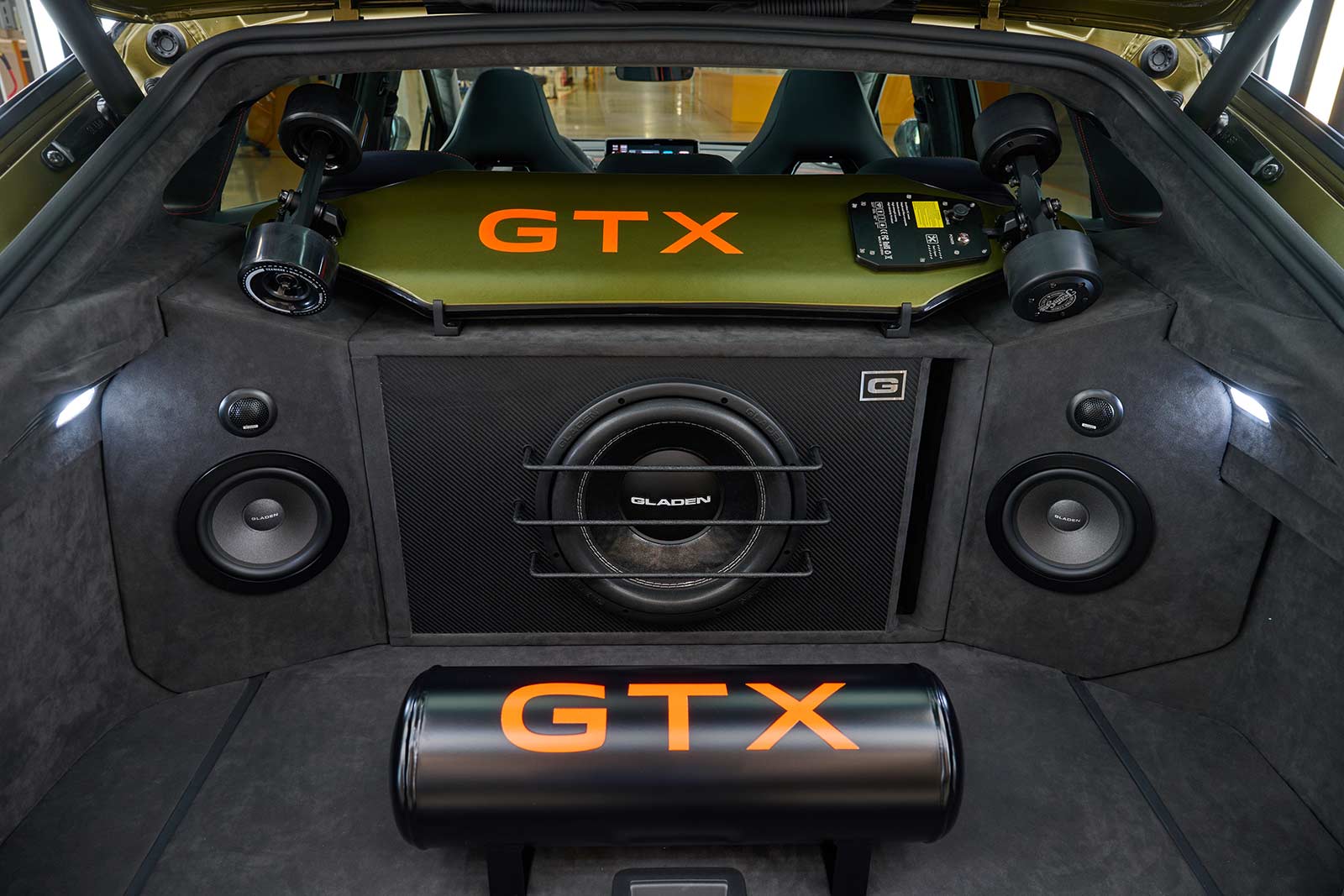 The car features a digital sound system designed by the project team using equipment from Gladen, Musway and Bang & Olufsen, with 10 amplifiers, a subwoofer and a total output of 2000 watts. There is also a highlight in the trunk: the Teamgee H5 electric skateboard is the perfect companion for the last few meters from the car park to the driver’s destination.