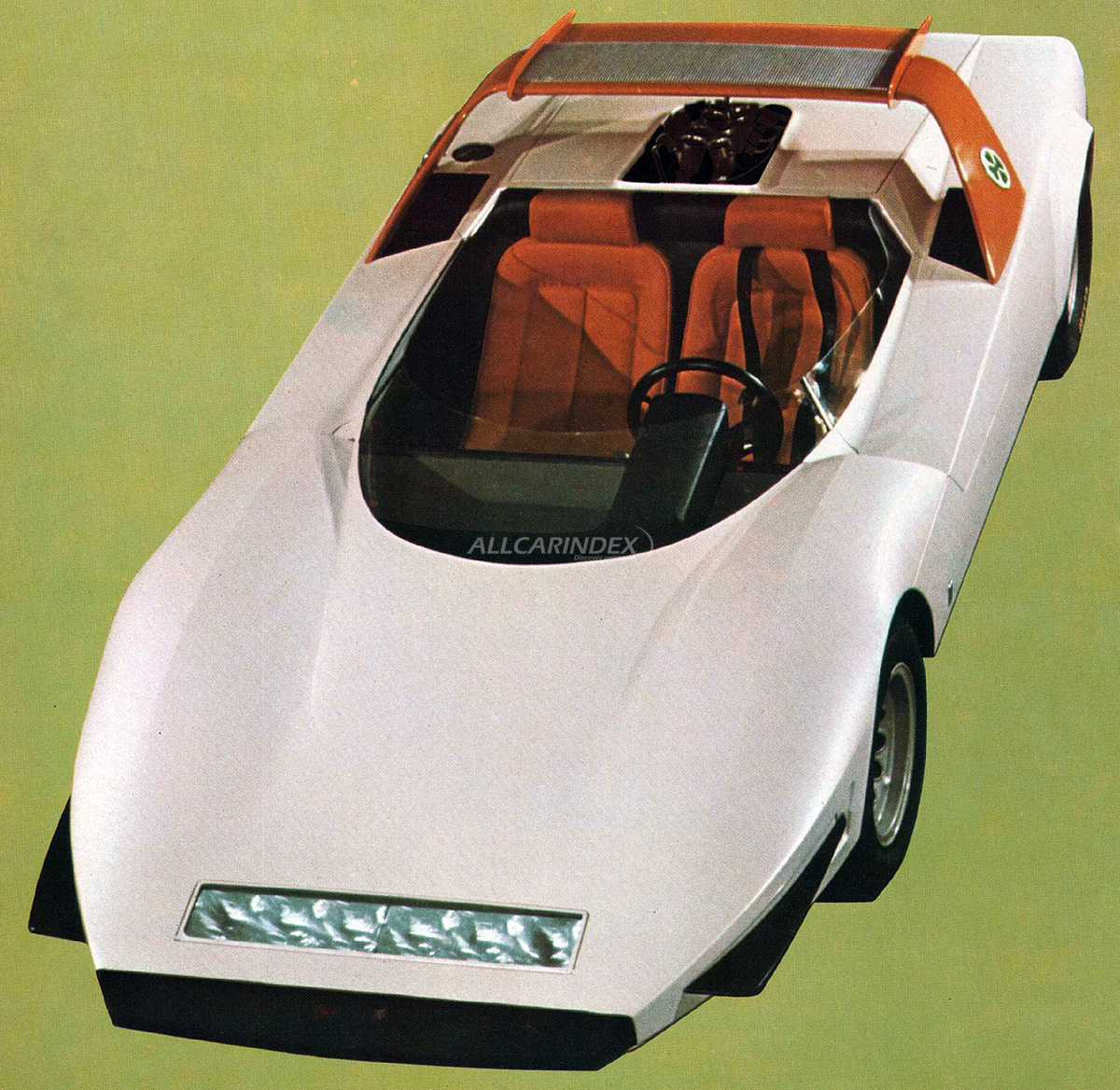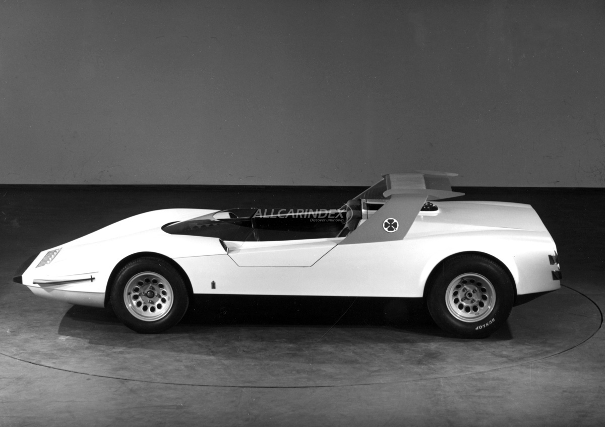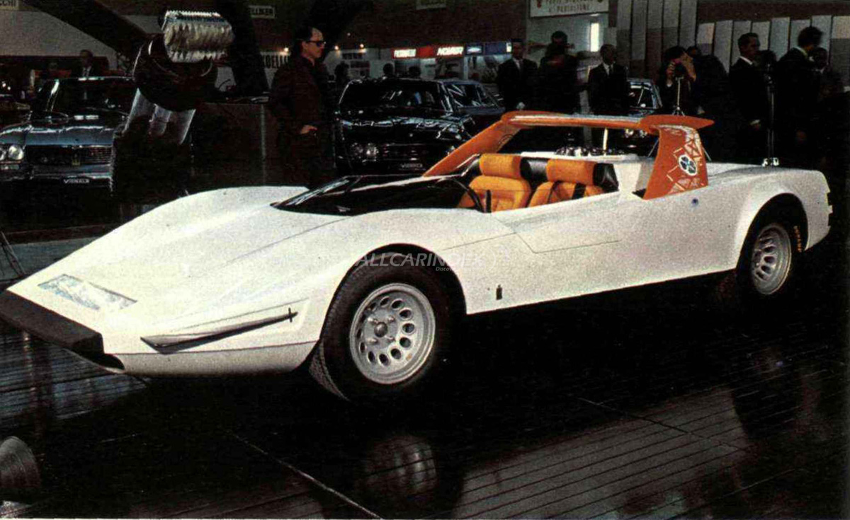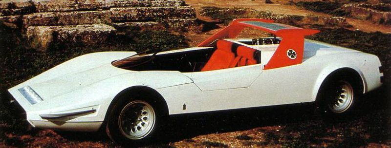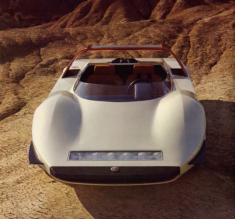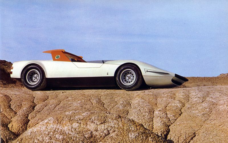 Fundamentally different from the design of the Ferrari P5/6 and Coupé 33 prototypes, the cabriolet, with its taut lines and sharp angles, demonstrates how Pininfarina was continuously pushing back the boundaries of style and efficiency. The cabriolet was built on an Alfa Romeo Type 33 sport cars chassis with a V8 mid-mounted engine, with large overhead spoiler and "beetle-wing" doors.