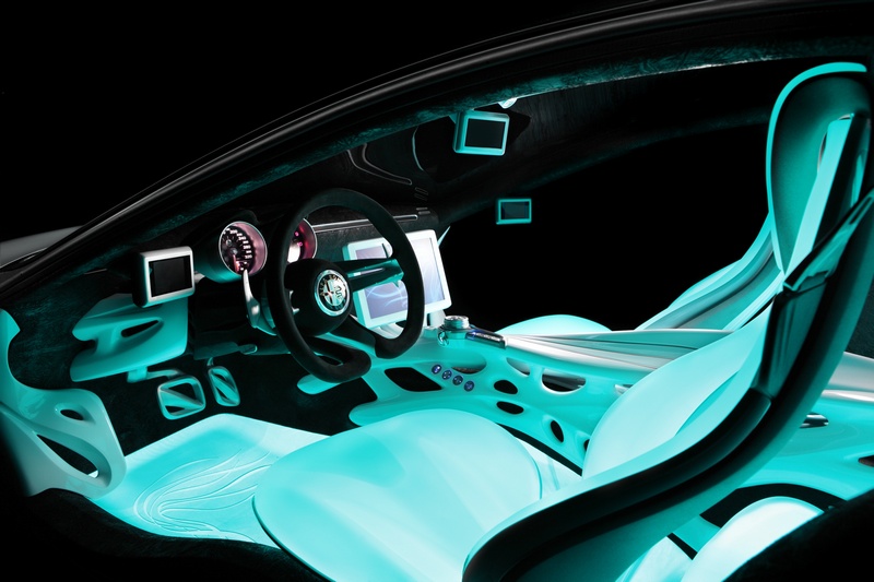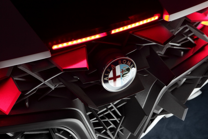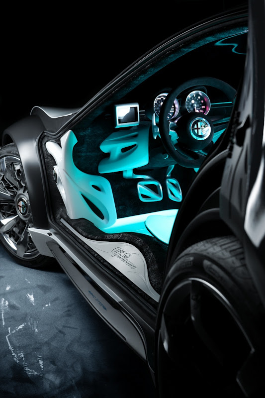 The taillights are fully integrated into the organic tangle of the blades and disappear when turned off. The new Alfa Romeo family feeling is again visible in the rear of the car with same V-shaped bumper found on the front of the vehicle, which the travels the entire length of the body, forming a powerful virtual, Alfa Romeo backbone.