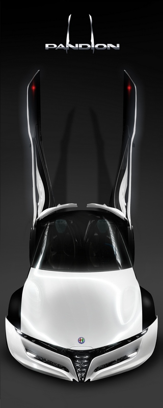 The Pandion: an extreme and controversial sports car in typical Bertone fashion. The size of the concept car (4620 mm in length, 1971 mm wide, 1230 mm high, 2850 mm wheelbase) offers a compact sports car external dimensions with a large sports car interior feeling, all powered by a 4.7 litre, 450 CV 8-cylinder Alfa Romeo engine.