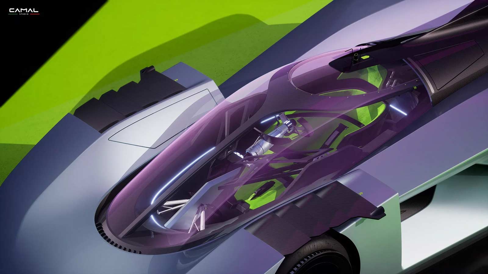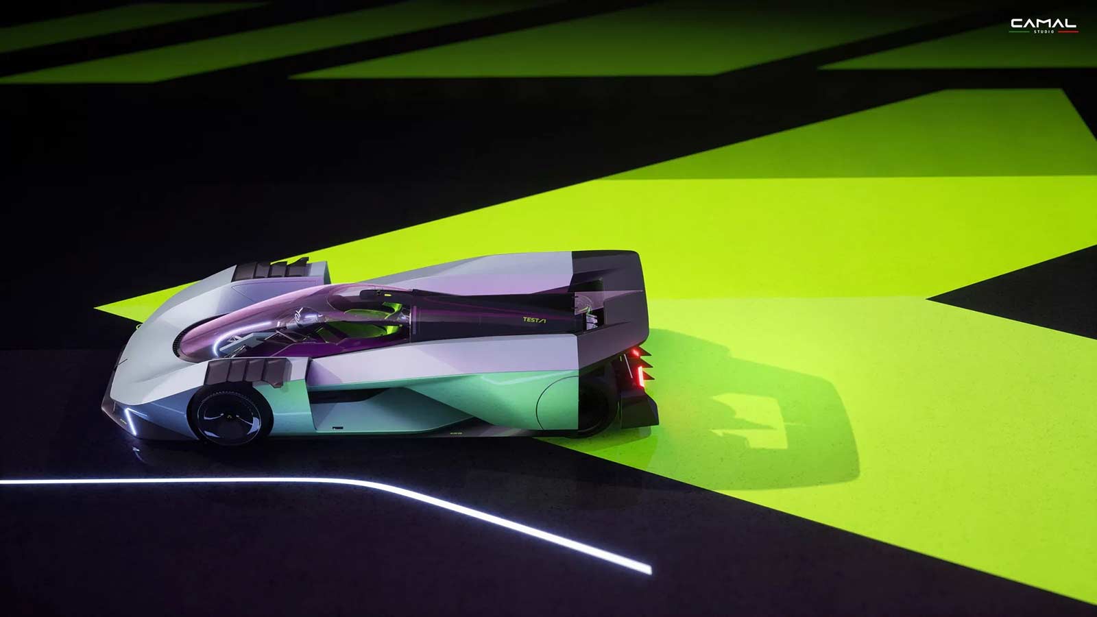TEST/1 is the stylistic interpretation of a sports car on LMH proportions, powered by a powerful jet engine, as a nostalgic tribute by the CAMAL team to the historic Fiat Turbina of the 1950s. The design of the car seeks to explore the new trends of the moment, embracing sculptural lines and monolithic volumes, interspersed with clean lines and exposed mechanics. Through a completely transparent ‘rocket shape’ cabin, the wedge-shaped body of the car defines aerodynamic profiles, using sharp sections and large openings necessary for the powerful aero engine.