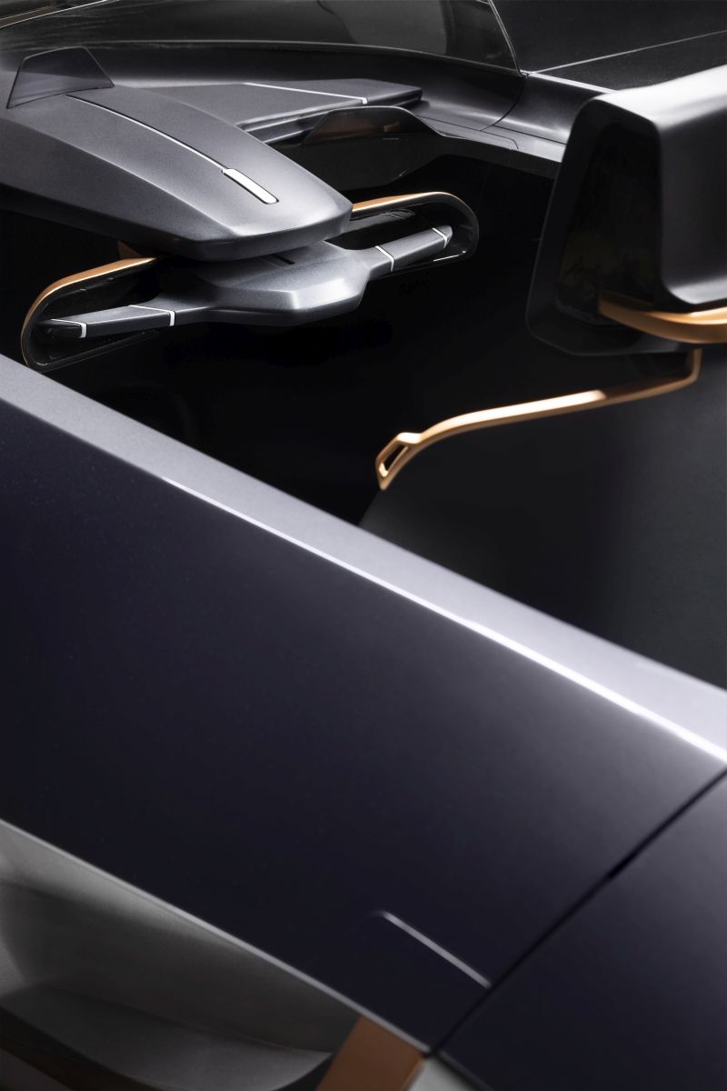 Misano (length 4000 mm – width 1750 mm – height 1000 mm – wheelbase 2600 mm – axle spacing 1500 mm) is a sporty and compact vehicle, an experimental reinterpretation of the classic barchetta. The innovative asymmetric design features two tandem seats atop four wheels. In the search for elegance and purity, the smooth contours of the exterior envelop the visible cockpit. The lack of roof reveals the off-centre driving and passenger seats which leave the right section empty, allowing space for a battery pack and a sideways boot. Misano radiates sportiness not only in the bold front design, with its distinctive arrow-shaped headlights, and in the aerodynamic form of the rear, which guides the air flow through two wedge wire meshes, but above all in its driving experience. Protected only by a small windshield, the driver controls the vehicle not with a steering wheel but with a clearly motorcycle-inspired control stick.
