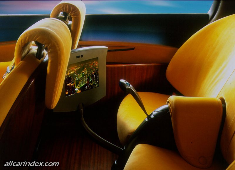 The front armchairs can carry out 12 different movements (automatically controlled) and form a single sofa when placed together, which configures itself to suit the form and sitting position of its occupants. The configuration is stored for subsequent use but may be changed - to suit a new passenger, for example. The seat squab back is covered in soft wood and the edge is finished in heartwood. The head-restraints and armrests are made out of constant thickness cushions. The whole front bench may be turned through 180°. This action converts the passenger compartment into a comfortable lounge, ideal for a tête à tête conversation with back seat passengers.