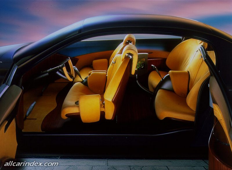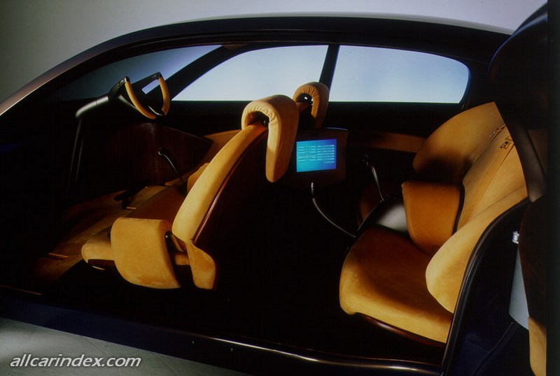 So the front seats turn outward through 90° to allow the driver and passenger to sit down, before returning to their original position. The car recognises people by means of their Ego Card personal keys and adapts to their habits, life styles and driving styles: left hand drive or right hand drive, steering wheel and pedal unit, climate control, light distribution and intensity - and sound. Conventional seats have been replaced by armchairs. These mould themselves around the body. Ventilation and lighting of the preferred colour and intensity are diffused through breathable trim. As we wallow in an environment of wrap-around, continuous forms, our senses are soothed by wood that is soft to the touch, chamois leather, cashmere and relaxing images from three screens on a facia. Yet the facia is not in the normal place, but tucked away at the bottom where it cannot get in the way.