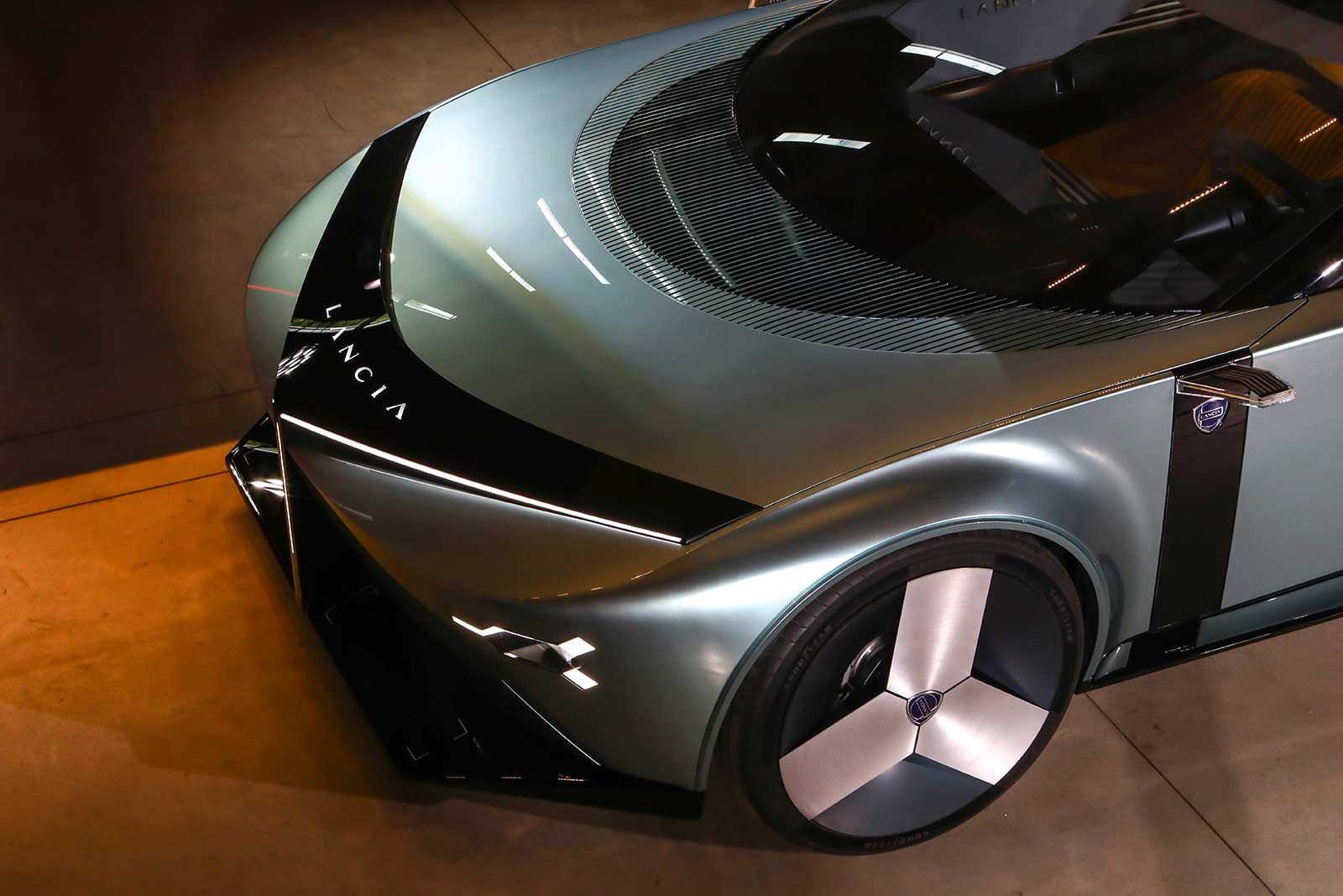 The dialog between past and future can also be found in the rear, where we can see the iconic round lights, inspired by the brand’s bluntest and most radical spirit, while a clear reference is further made to the legendary Lancia Stratos, with the iconic new Lancia lettering placed between the lights.