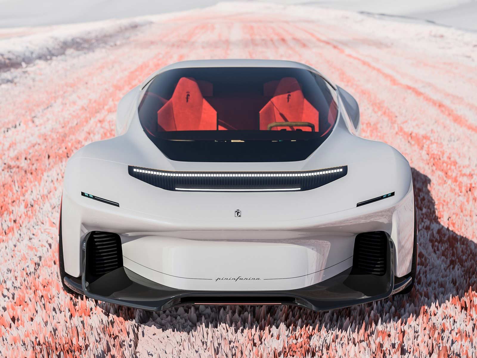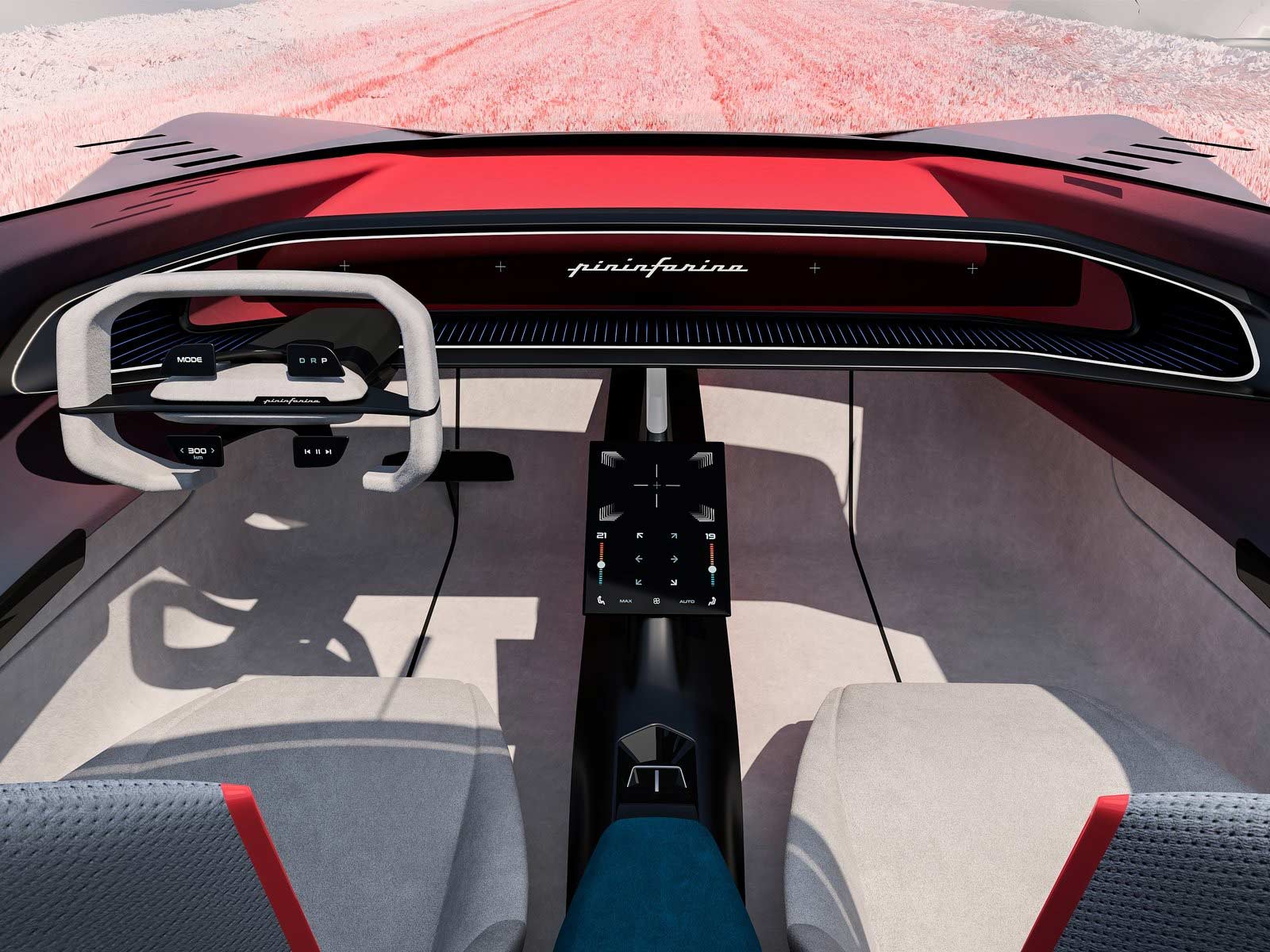 - a powertrain technology aimed at a very efficient combination of weight containment, driving fun, and sustainability. Pininfarina’s technology neutral approach led its designers and engineers to adopt a hydrogen-powered internal combustion engine driving the rear wheels, coupled with an electric motor at the front axle. This configures an AWD (All-Wheel Drive) setup, very consistent with a high performance GT car.