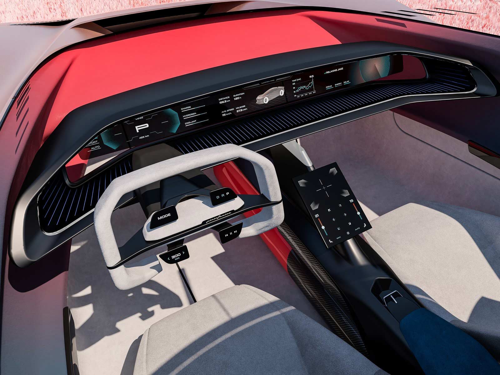The approach focused on ingenious, advanced and sustainable materials finds expression in the light-sculpted seating in the front, suggesting comfort. An uninterrupted band of high-touch material creates an intimate and sporty atmosphere within and integrates the rear seats.