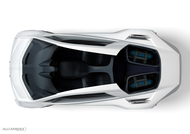 The optimal placement of fuel cell components for performance also allows for a relatively large passenger cabin by conventional supercar standards with enough space for three seating positions. The interior layout focuses primarily on the driver with a racecar-like center driving position. The enclosed canopy opens upward from the rear to allow for entry and exit. Two rear passenger seats flank the driver's left and right side.
