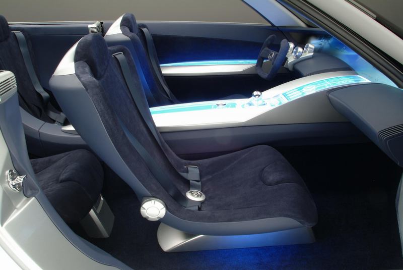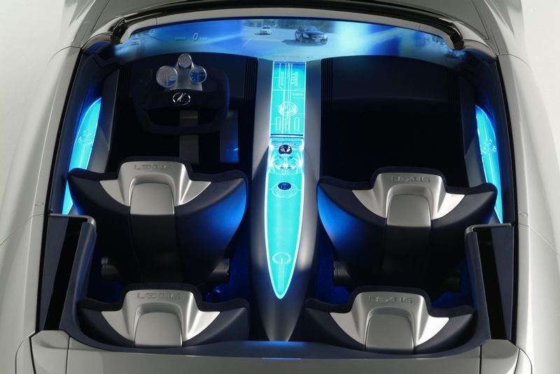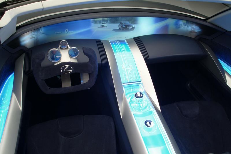 A dynamic and flowing centre console, in a solid tapered form, runs the length of the interior. Displays and controls are hidden beneath this transparent console surface that is multi-layered, which creates a sophisticated, high-tech look and feel. The console is flanked on each side by arched, wing-like instrument panels situated low in front of the driver and passenger to create a feeling of openness.