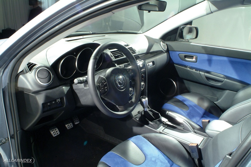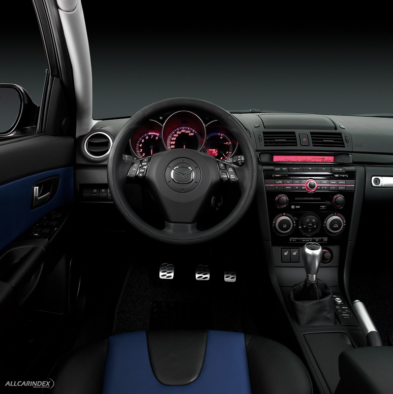 For the interior, Mazda presents a sporty yet comfortable design, an overall ambiance that evokes visual excitement and, thanks to materials carefully selected for their texture and appearance, adds to the overall delight of driving. The instrument panel and door trim have a simple, clean-cut form that creates a modern-looking space with an open, spacious feel. Finished in a high-gloss, piano black appearance, the instrument panel's central stack is not only elegant, it assures good visibility and ease-of-use when driving. In addition, the three-meter cluster and metallic interior accents add to the exquisite interior appearance.