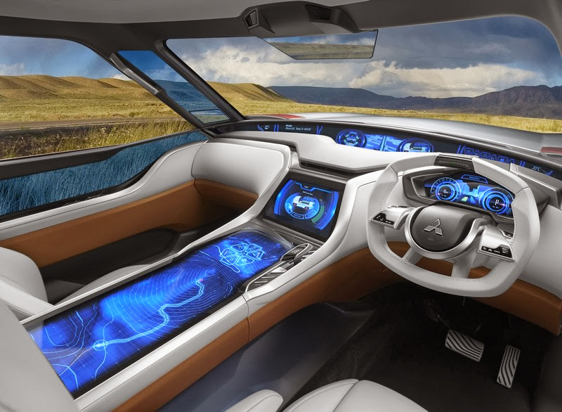 MITSUBISHI Concept GC-PHEV is equipped with the advanced “connected car” technology which utilizes next-generation information systems. This technology is set to bring significant changes to the time we spend in our cars. Linked to a vehicle information network, the connected car system uploads vehicle status information on a real-time basis and links it with traffic in the vicinity, traffic signal and other information to advise the driver on how to drive their car more economically. The system also provides a Failure and Malfunction Early-detection System, which urges the driver to seek repairs or service, as well as an Accident Damage Prediction Reporting function including link to the Japanese Help Net and other emergency and safety services. Connected car technology helps driver and occupants enjoy reassuring safety, convenience and comfort in their motoring life. Looking at further possibilities for connected car technology, Concept GC-PHEV is fitted with some novel interface systems. These include the AR Windshield, which utilizes augmented reality technology, as well as the Tactical Table large touch-operated display located in the center of the vehicle.